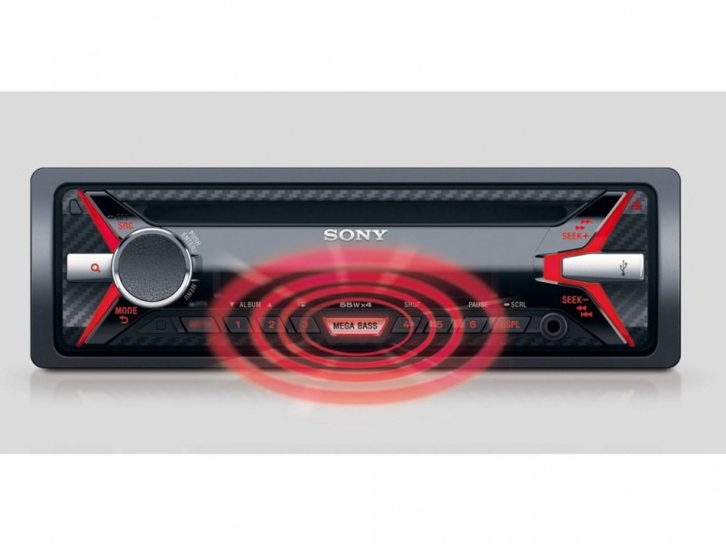 Autorádio SONY rozměru 1DIN s CD přehrávačem, USB vstupem, MEGA BASS EQ5 a výstupním výkonem 4 x 55W, červená barva podsvícení.