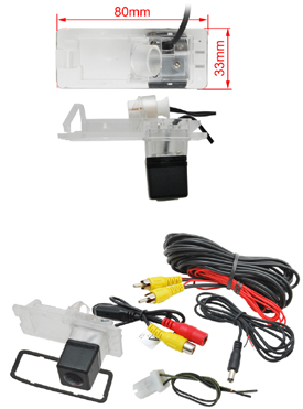 CCD parkovací kamera pro instalaci na místo osvětlení zadní registrační značky. Součástí kamery je místo pro umístění patice se žárovkou z původního světla pro registrační značku.