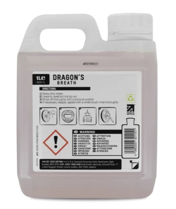 Už sám název naznačuje, že se bude jednat o něco speciálního - v překladu "Dračí dech". Je to z toho důvodu, že dost zapáchá a po chvilce přípravek na kole nebo karoserii výrazně zrůžoví. Dragons Breath je pH neutrální čistič kol a velmi efektivní odstraňovač polétavé rzi. ValetPro Dragons Breath skvěle reaguje se železitým znečištěním, které není příliš vidět, ale na karoserii a na kolech je ho většinou hodně. Tato chemická reakce dokáže měnit železo na vodorozpustný roztok. Dragon Breath lze bezpečně používat i na leštěná kola.