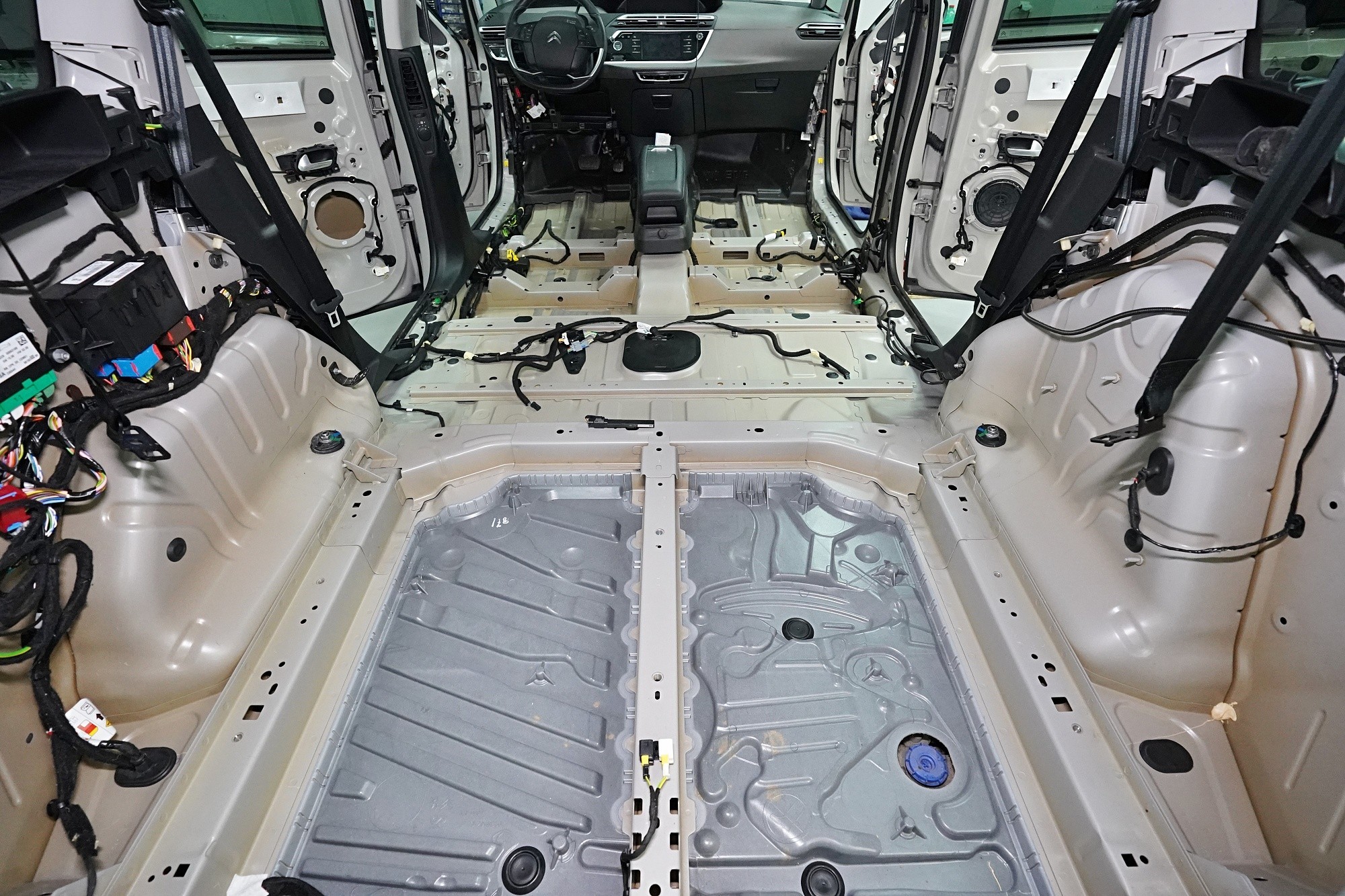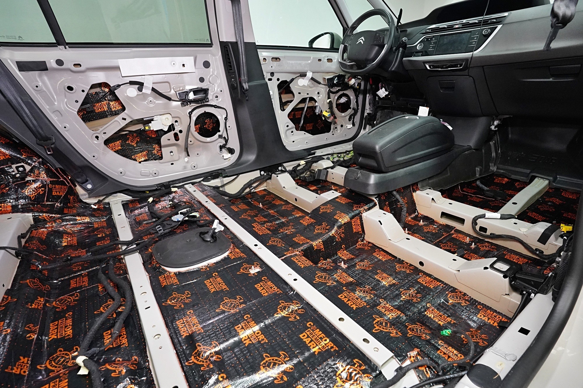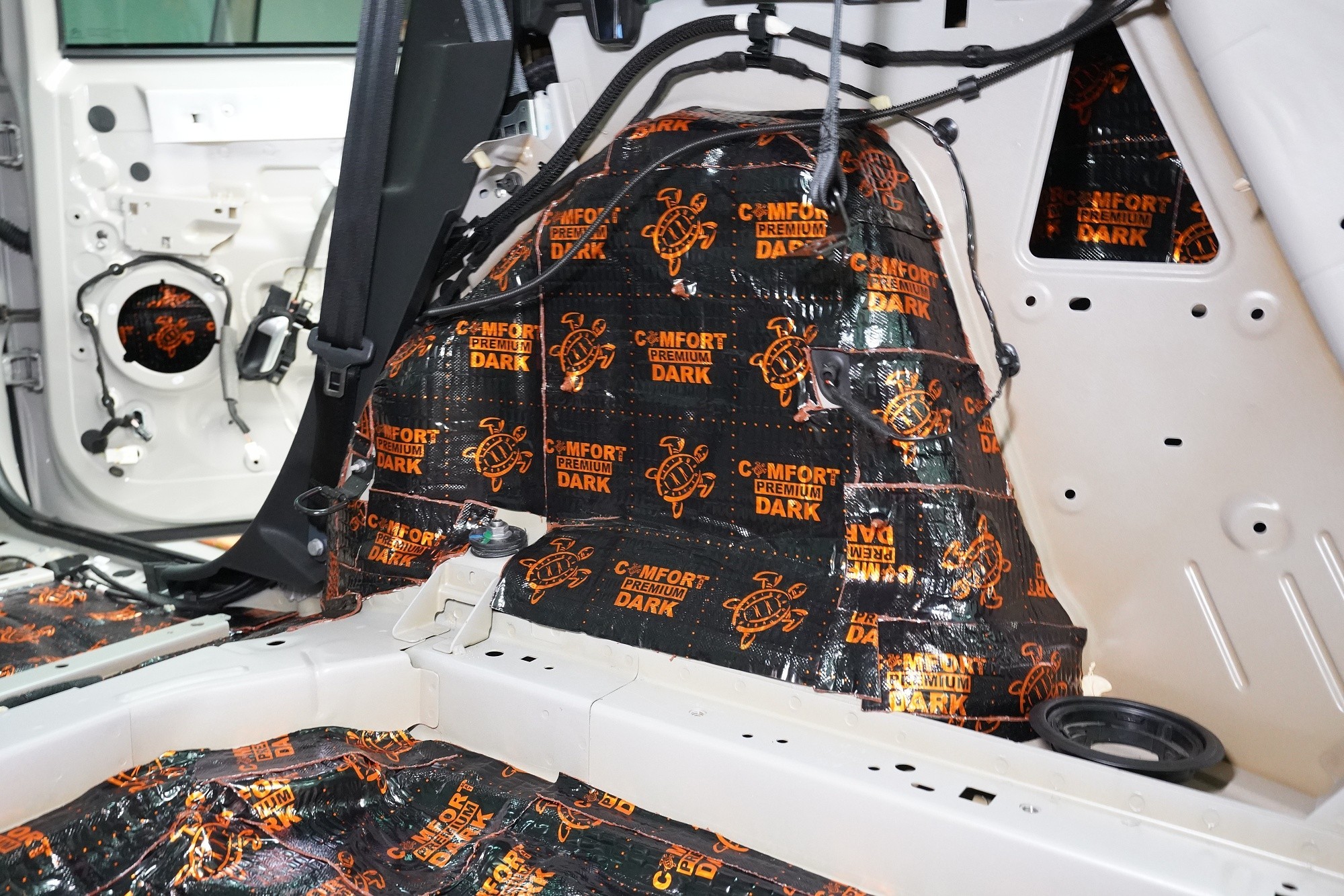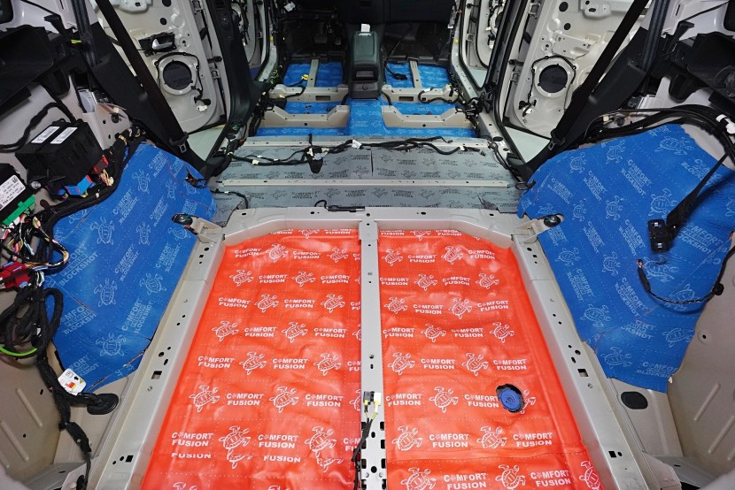 Dark D4 spolu s druhou vrstvou aplikujeme na všechny přístupné oblasti, abychom umožnili izolaci maximálního množství vibrací a hluku. V přední části podlahy se dostáváme až pod palubní desku, díky čemuž důkladně odhlučníme i přední podběhy z vnitřní části vozu, kde je přístup k větší ploše karoserie. Podlahu odhlučňujeme vysoce účinným antivibračním materiálem o tloušťce 4 mm a zvukově izolačním materiálem v druhé vrstvě o tloušťce 7 mm. Celkem tedy 11 mm zvukové izolace, což má za následek důkladné zamezení hluku od předních pneumatik i bez aplikace z vnější strany.