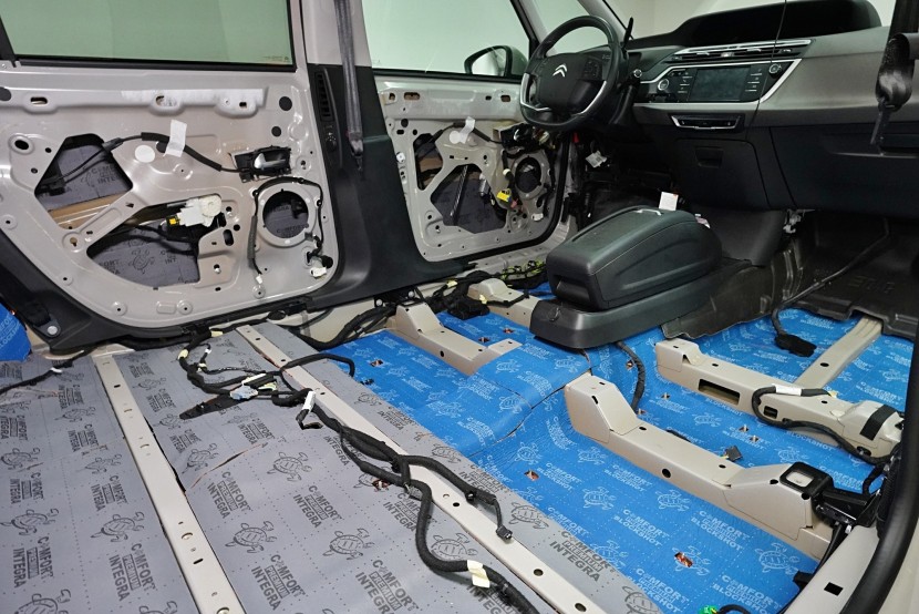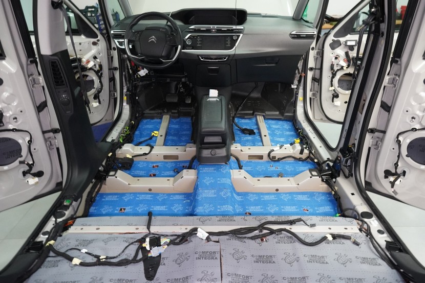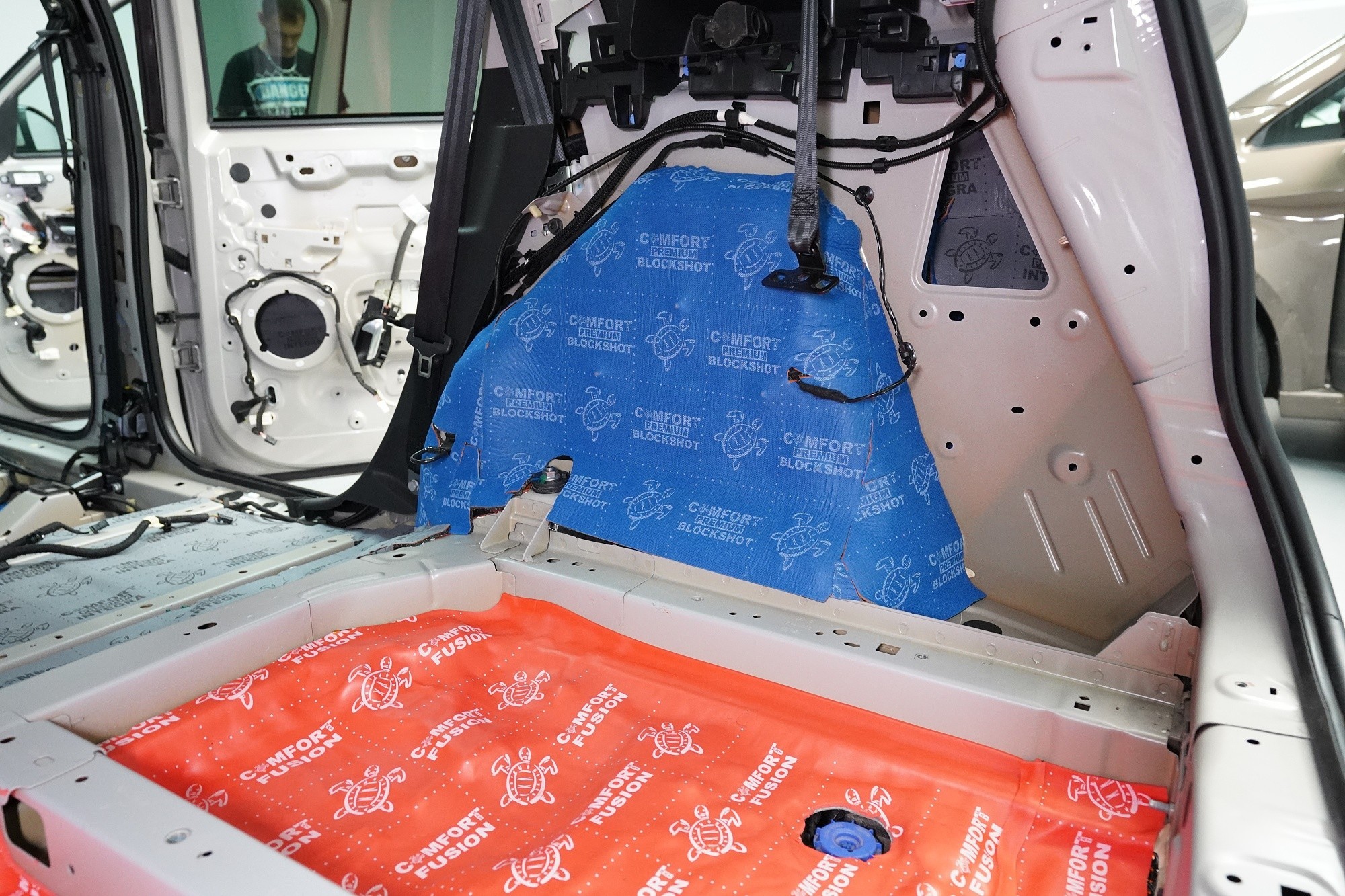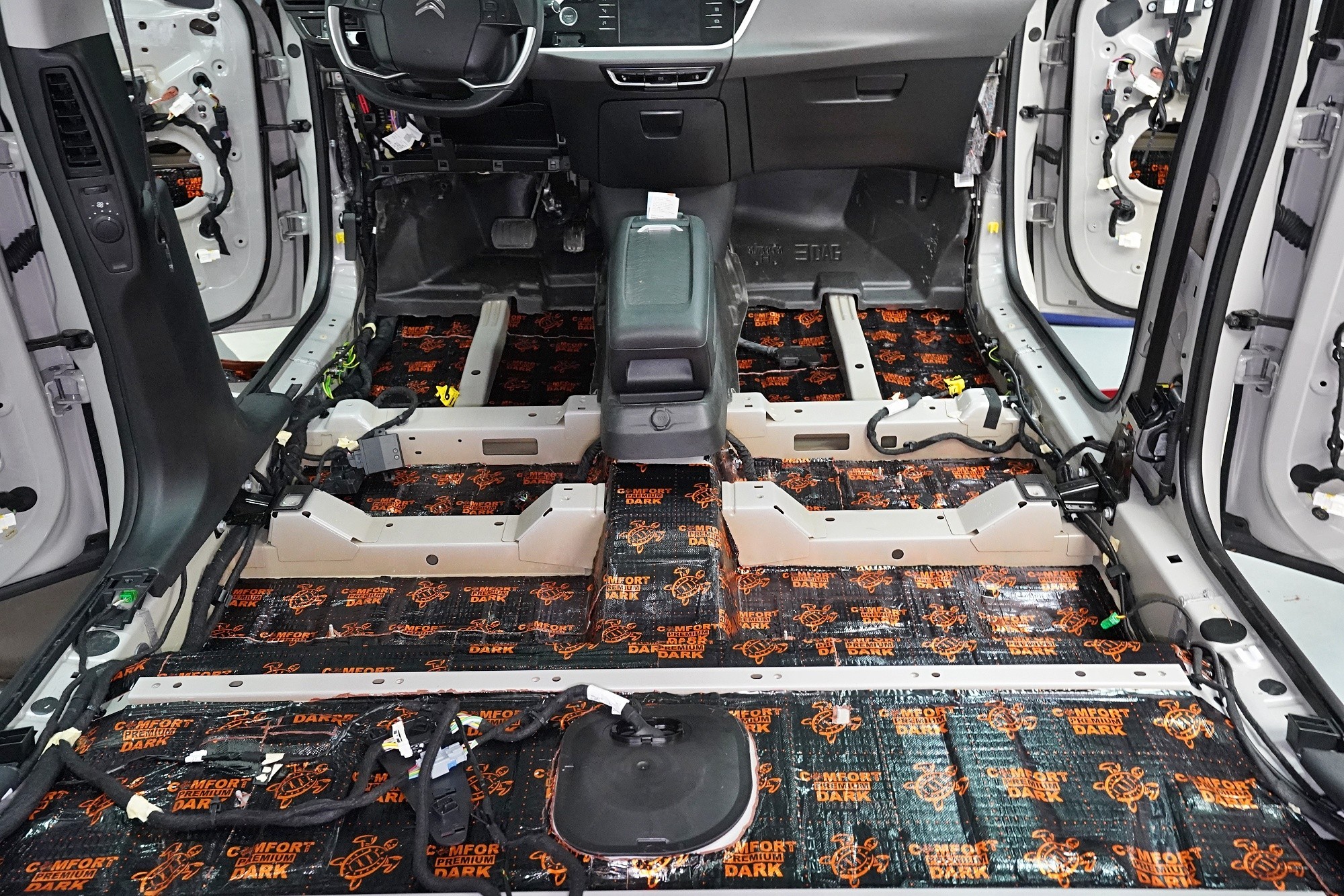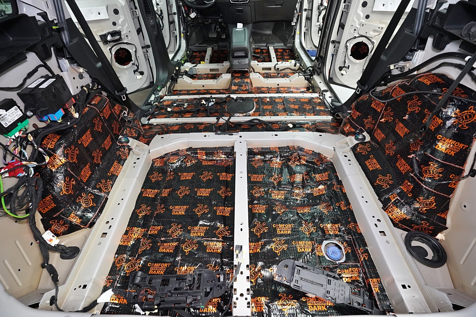 Odhlučnění podlahy je kvůli extrémním vibracím i výraznému nízkofrekvenčnímu hluku základem pro úspěšné odhlučnění vozu. První vrstvou je prémiový antivibrační materiál Comfortmat Dark D4 o síle 4 mm, který disponuje akustickým ztrátovým činitelem (MLF) o vysoké hodnotě 0,49 jednotek. Antivibrační materiál s těmito vlastnostmi dokáže účinně zamezit šíření vibrací a nízkofrekvenčního hluku a to při zachování nízké hmotnosti. Na prostor pod zadními sedačkami aplikujeme totožný materiál, pouze o tloušťce 3 mm a MLF 0,41 jednotek.