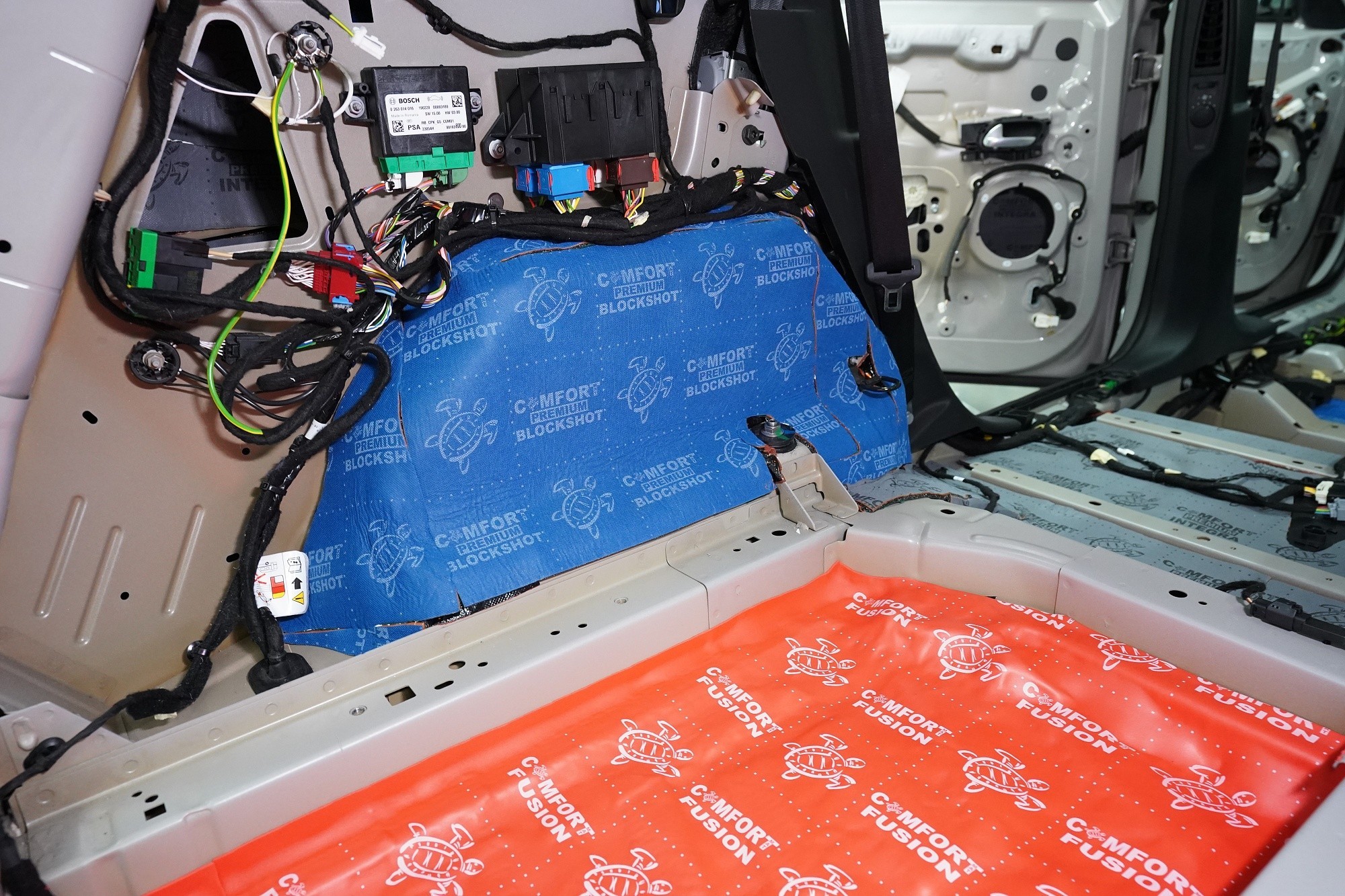 Podobným způsobem odhlučňujeme zavazadlový prostor. I dno kufru je velmi zatěžováno vibracemi a hlukem a musíme tedy postupovat s velkou pečlivostí. Na dno kufru aplikujeme stejný materiál jako pod zadní sedačky, tedy Comfortmat Dark D3 o tloušťce 3 mm a MLF 0,41. Ten nejen absorbuje veškeré vibrace, ale pohltí i nízkofrekvenční hluk v této oblasti.