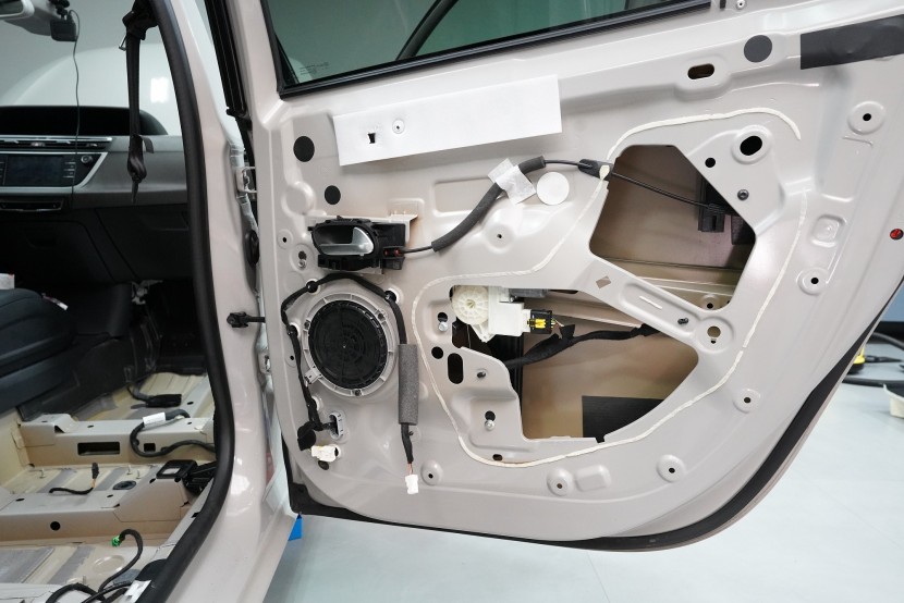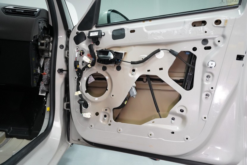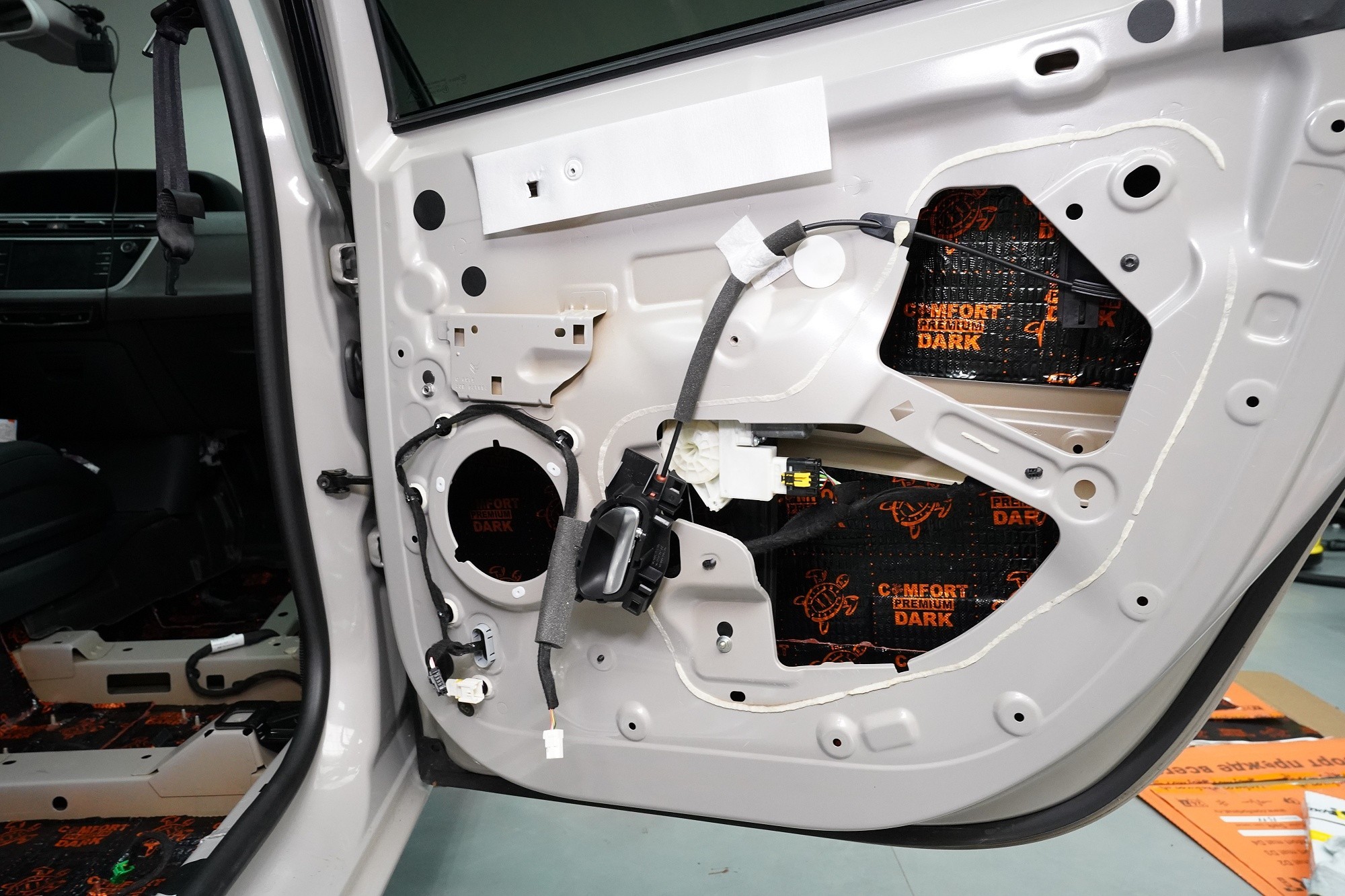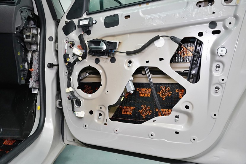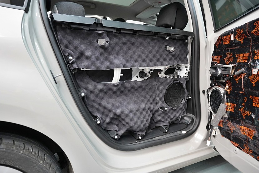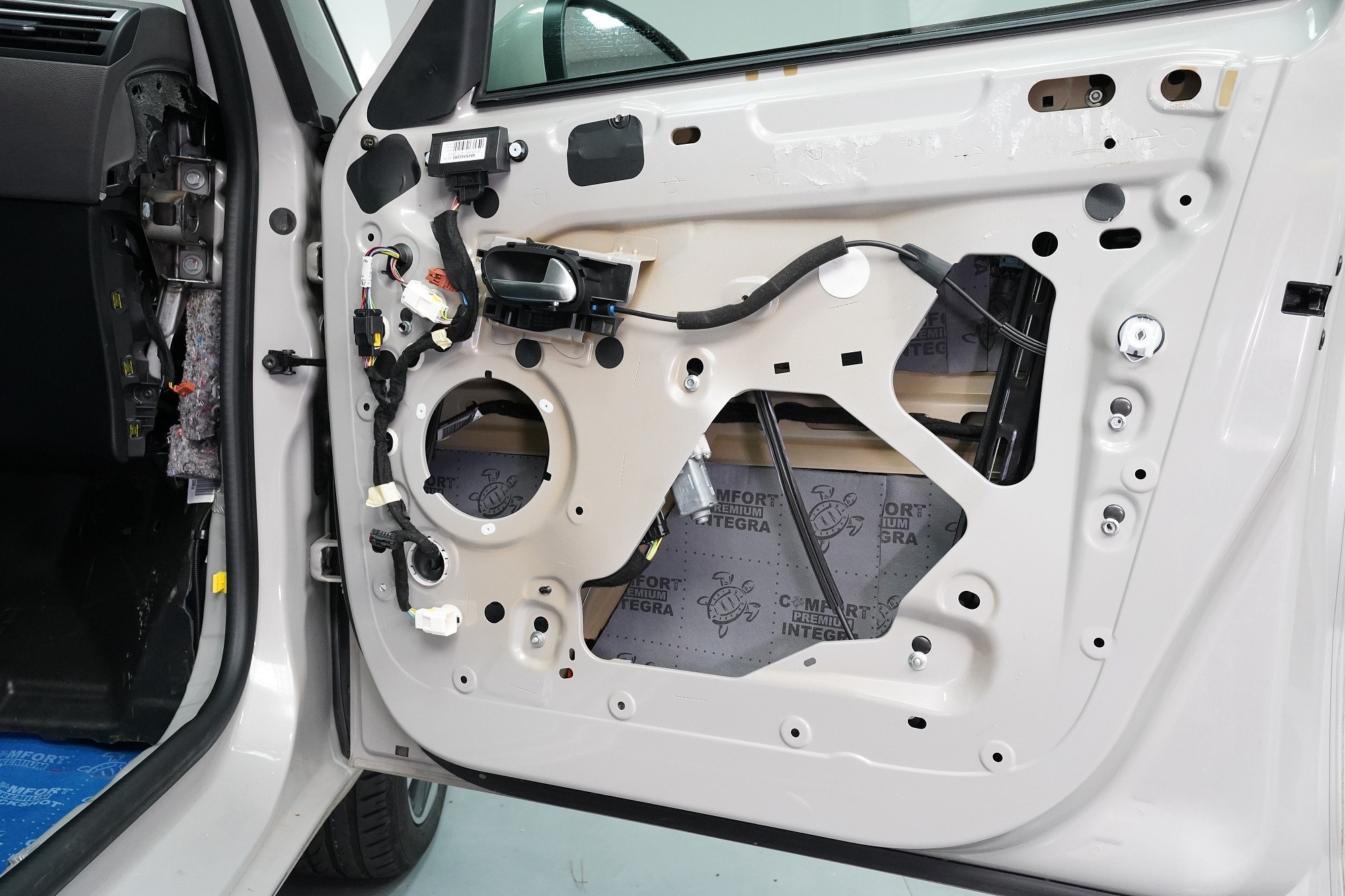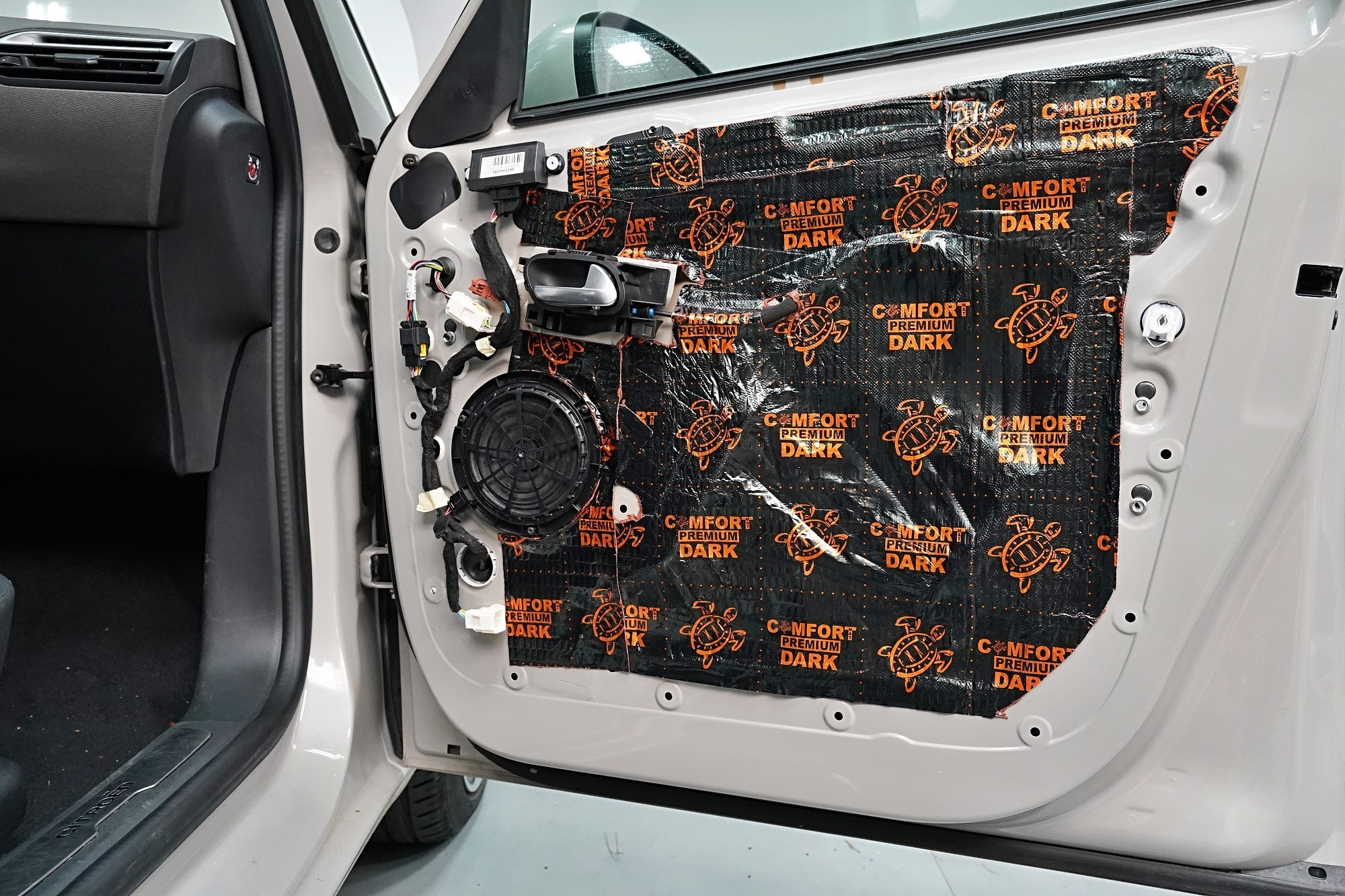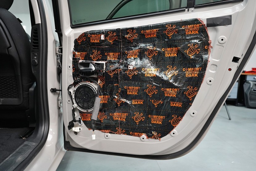 V rámci balíčku Premium volíme na vnější plech dveří lehký antivibrační materiál Comfortmat Dark D2 o tloušťce 2,3 mm. Ten zlikviduje vibrace, zamezí pronikání nízkofrekvenčního hluku a zpevní velmi tenký plech dveří. Materiál disponuje velmi nízkou hmotností, je samozřejmě absolutně voděodolný a má mimo jiné antikorozní vlastnosti.