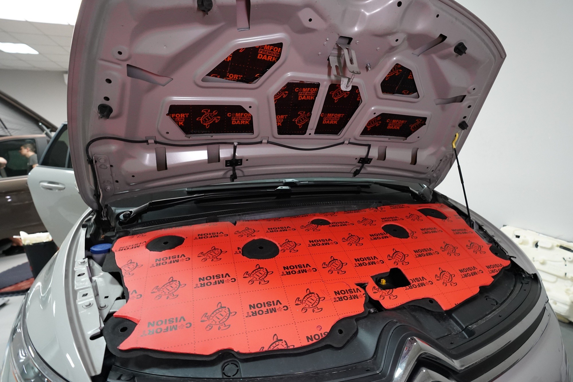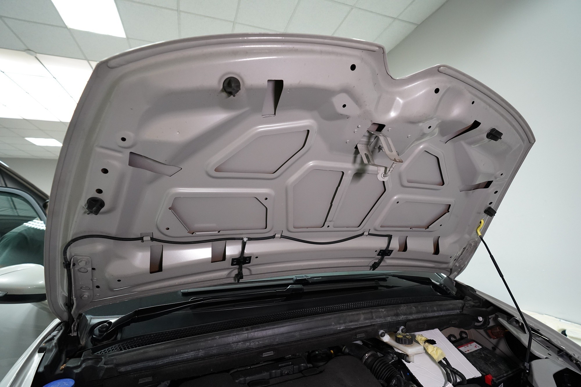 Nezapomínáme ani na kapotu, na kterou v první vrstvě aplikujeme opět lehký antivibrační materiál Comfortmat D2. Tím kapotu zpevníme, zamezíme vibracím, které se přenáší do dalších částí vozu a zmizí i typický plechový zvuk při zavření kapoty. Na originální kryt kapoty následně aplikujeme zvukově i tepelně izolační materiál Comfortmat Vision, který sníží hluk motoru a to při zachování původního vzhledu motorového prostoru.