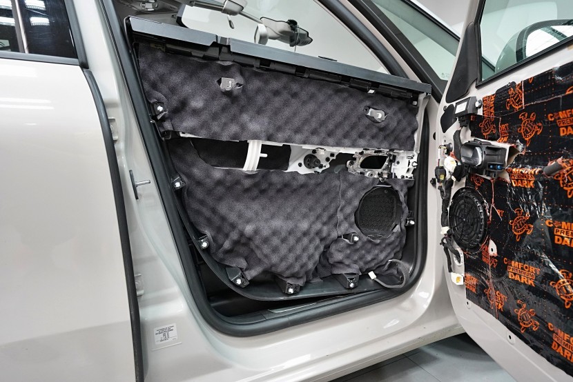 Poslední vrstvou je Comfortmat Softwave o tloušťce 15. Tato flexibilní pěna s tvarovou pamětí se lepí na plastové čalounění dveří z důvodu zamezení skřípání a vrzání nejen plastů, ale i drátů a dalších komponent uvnitř dveří a dodatečně i sníží hluk této oblasti. Stejný postup volíme i u zadních dveří.