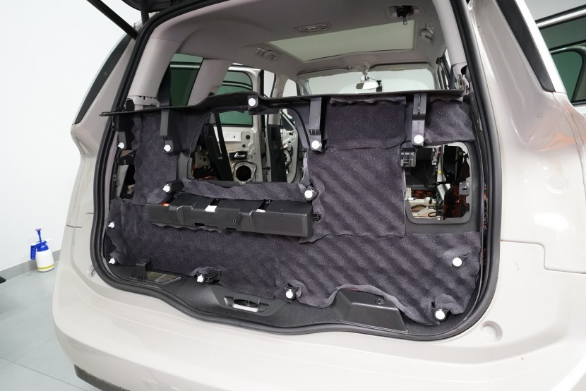 Páté dveře u tohoto vozu nejdou opatřit žádnými materiály, proto alespoň na plastovou výplň pátých dveří aplikujeme v první vrstvě bodově antivibrační materiál Comfortmat D2 pro zpevnění a zamezení vibrací a rezonancí a jako druhou vrstvu volíme polyuretanovou pěnu Comfortmat Soft Wave.