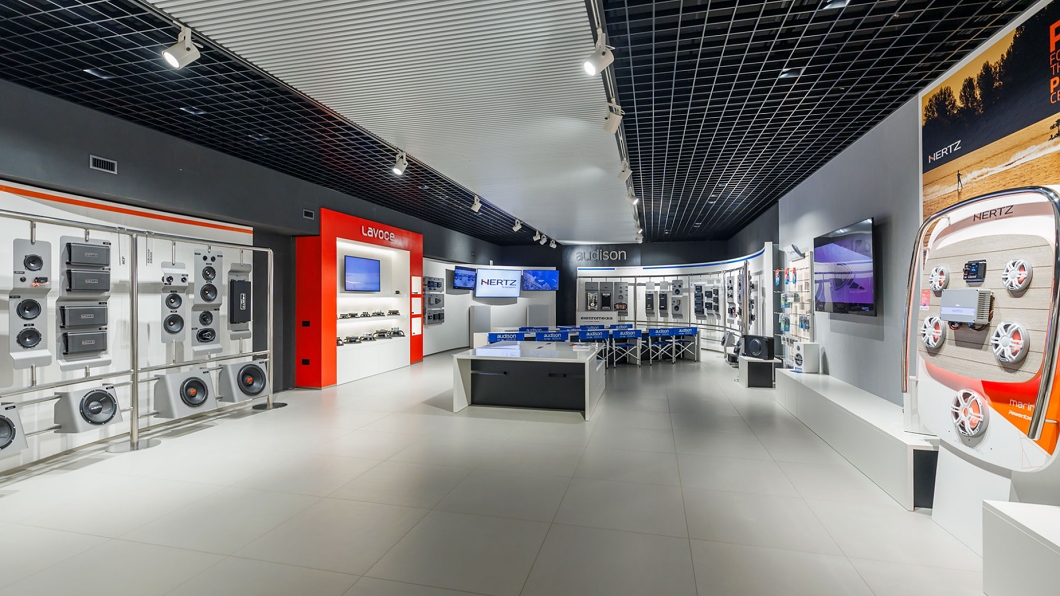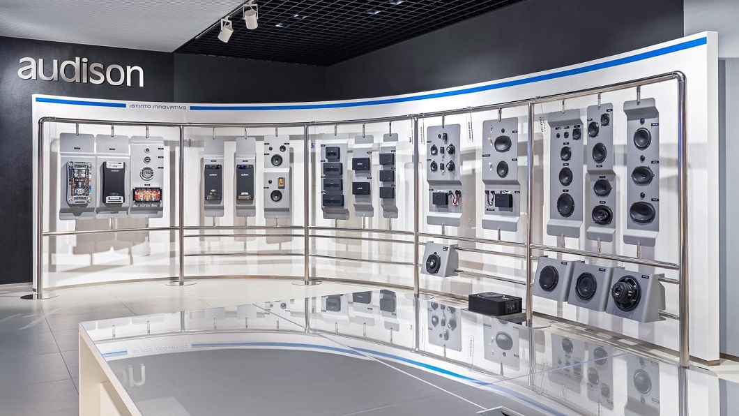 Showroom se značkami Hertz, Audison, Connection a Lavoce v sídle Elettromedie.