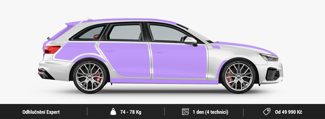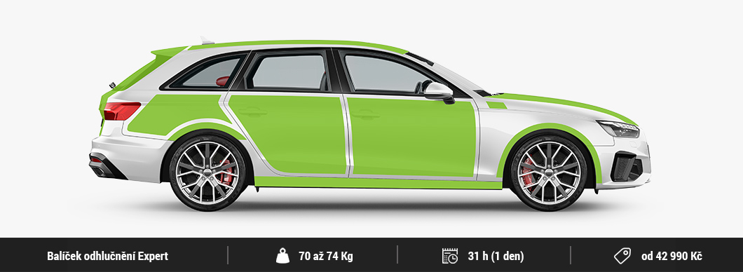 Odhlučnění Expert zahrnuje všechny klíčové oblasti vozu a oproti balíčku Premium odhlučňujeme také střechu a torpédo (prostor pod čelním sklem. Využíváme špičkové materiály Comfortmat z modelové řady Premium a na všech plochách aplikujeme minimálně dvě vrstvy vysoce účinných antivibračních a zvukově izolačních materiálů. Díky tomu dosahujeme výrazného snížení hluku v interiéru, zlepšení akustiky audiosystému i znatelného tepelného komfortu. Samotná montáž probíhá zpravidla během jednoho dne, kdy na voze pracuje čtyřčlenný tým zkušených techniků. Celková hmotnost použitých materiálů se pohybuje v průměru okolo 76 kg v závislosti na typu vozidla. Pro nejnáročnější zákazníky nabízíme také vylepšenou variantu Expert Plus, která využívá silnější a účinnější materiály z nejvyšší řady Comfortmat Expert.