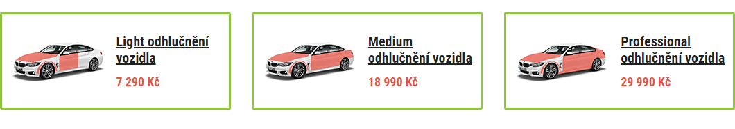 - Luxusní balíček tlumení Professional: Pro zákazníky, kteří nejsou limitování financemi, očekávají nekompromisní výsledek a požadují vždy jen to nejlepší. Tlumíme přední a zadní dveře + 5. dveře, celý zavazadlový prostor včetně zadních podběhů, podlahu, přední podběhy a prostor za kolem, kapotu a nakonec prostor pod čelním sklem v motorové části (tzv. torpédo). Možno vytlumit za malý příplatek i celý strop pro dokonalé ticho v autě.