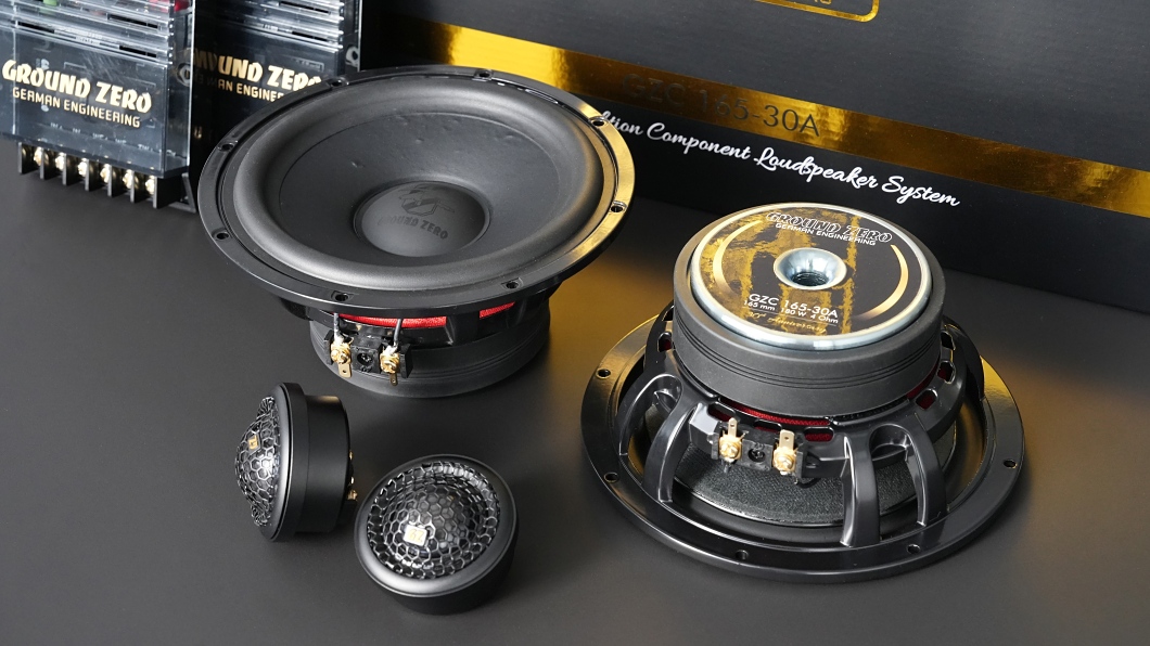 Také komponentní systém Ground Zero GZC 165-30A vychází z řady Hydrogen, ale s několika důležitými úpravami. Woofer má velkou a odolnou 38 mm cívku, silný feritový magnet a přesně navržené pólové destičky. Na první pohled vypadá, až na černý design koše, podobně jako standardní model. Ale rozdíl je v detailu – nově spočítané odpružení dle simulačního softwaru a ověřování na Klippel systému a červený centrovací spider, který je poznávacím znamením novějších modelů Ground Zero. Skutečným výročním bonusem je ale tweeter. Ten vychází z vyšší série Nuclear a jde o velkou 28 mm hedvábnou kalotu s tlumeným spojovacím objemem. Díky tomu klesá rezonanční frekvence a výškový reproduktor může hrát níž, než je běžné. Výhybka je poctivě osazená a nabízí možnost doladění výšek i jemného útlumu středního pásma.