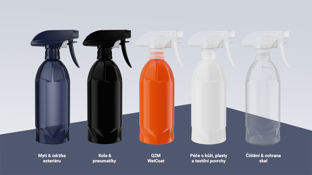 První změny si všimnete ihned po vybalení. Všechny produkty řady Q²M dodávány s rozprašovači pevně namontovanými z výroby. Tento krok především eliminuje možnost vytečení láhve a urychlí práci. Samotné rozprašovače však získaly i několik inovací. Na hrdlo byly přidány "žraločí zuby", je možné přepínat mezi dvěma typy rozprašování a všechny produkty mají nyní dva systémy dětské pojistky v souladu s normamy ISO. Co se týče designu samotné láhve, tak byl zachován ikonický krystalový tvar, dno láhve však bylo pro větší bezpečnost při přepravě vyztuženo. Celkově vzato se nové láhve fantasticky drží v ruce a práce s rozprašovačem je velmi příjemná a stabilní.