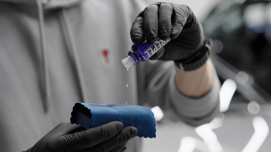 Po důkladné přípravě skla přichází samotná aplikace keramické ochrany. Před začátkem si nasaďte ochranné gumové rukavice, abyste předešli kontaktu s pokožkou. Lahvičku s keramickým povlakem lehce protřepejte a nakapejte několik kapek na přiloženou aplikační houbičku obalenou suede utěrkou.
