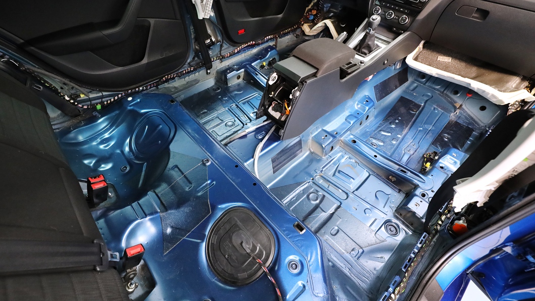 Dalším nezbytným krokem je aplikace účinného zvukově izolačního, chcete-li protihlukového materiálu, který zamezí pronikání hluku do interiéru vozidla. Díky špičkovým materiálům společnosti Comfortmat máme v nabídce několik různě účinných možností jak podlahu vozu odhlučnit. Nejčastěji v našich instalacích najdete prémiový membránový materiál Comfortmat Blockshot modré barvy o celkové tloušťce 7 mm a schopnosti zvukové izolace až 32 dB. Tak vysoká účinnost je dána především díky složení materiálu s protihlukovou membránou o tlouštce 2 mm. Druhou a výrazně účinější možností je aplikace membránového materiálu Comfortmat Titan Lite, který najdete v našich vylepšených balíčcích odhlučnění Premium Plus a Expert Plus. Titan Lite disponuje taktéž tloušťkou 7 mm, ale má zcela odlišné složení. Účinnější zvukově izolační vrstvu doplňuje 3 mm silná protihluková membrána, která umožní zvukovou izolaci až 36 dB. Titan Lite nahrazuje dvě vrstvy odhlučnění, na které jste byli zvyklí v našich dřívějších instalacích s kombinací materiálů Comfortmat Vision a Blockator. Nyní již dvě vrstvy nepožíváme, protože aplikace jedné vrstvy nového materiálu Titan Lite je snadnější, rychlejší a také účinnější. A konečně poslední možností, kterou můžete v našich instalacích vidět je nejúčinnější zvukově izolační materiál na trhu Comfortmat Titan. Tloušťka 8 mm a nepřekonatelná účinnost až 38 dB je doslova zabiják pro veškerý hluk libovolné oblasti vozu. Titan není levný ani lehký, ale pokud požadujete maximální odhlučnění podlahy, pak je tou nejlepší volbou. Ať už se rozhodnete pro jakýkoliv materiál, postup aplikace je totožný. Vždy se snažte využít co největší plochu materiálu a zbytečně jej nekouskujte. Ideálním postupem je si materiál předem přiložit na plochu, přeměřit a ustřihnout potřebný tvar. Poté materiál nalepte na první vrstvu odhlučnění v podobě antivibračního materiálu. Materiál v druhé vrstvě vždy aplikujte vedle sebe s co možná nejmenšími mezerami a vyvarujte se základní chyby, tedy překrývání okrajů. Stejně jako u první vrstvy, i ve druhé vrstvě aplikujte materiál na celou plochu podlahy až k palubní desce, čímž důkladně odhlučníte přední podběhy. Změna opět nastává při odhlučnění prostoru pod zadními sedačkami. Z důvodu menšího prostoru byl v Comfortmatu speciálně pro tyto účely vyroben memránový materiál Comfortmat Raptor o tloušťce pouhých 4 mm. Vícevrstvé složení s 2 mm silnou protihlukovou membránou však umožňuje zvukovou izolaci až 28 dB, což je pro tuto oblast naprosto dostačující. Spotřeba materiálů je totožná s první vrstvou, tedy obvykle 7 kusů materiálu o rozměru 700 x 500 mm na podlaze a 3 kusy pod zadními sedačkami.