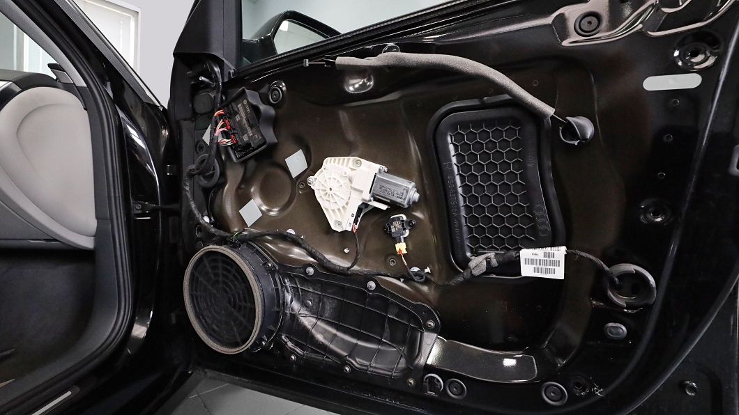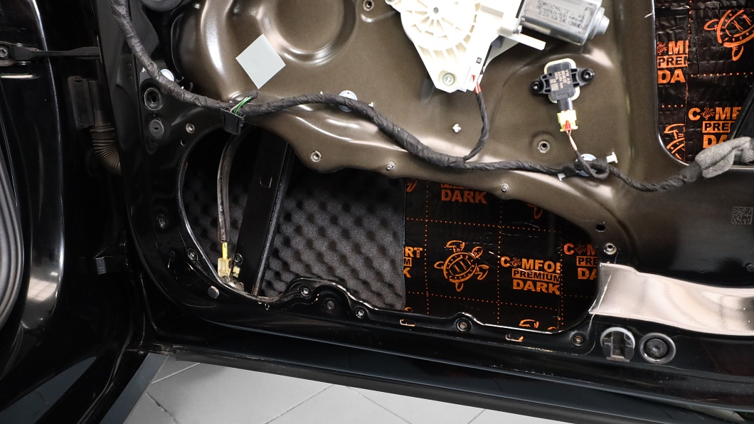 Vnitřní plech tlumíme nejen z důvodu zamezení vibrací a rezonancí, ale zejména proto, abychom dveře akusticky uzavřeli a vyplnili otvory ve dveřích. Tím vytvoříme reproduktorům uzavřenou ozvučnici. To vede k výraznému zlepšení akustiky reproduktorů, zejména jejich basové složky. A rozhodně nejde o zanedbatelný rozdíl, většinu našich zákazníků obvykle velmi překvapí, jak se změní zvuk po vytlumení dveří i u továrních reproduktorů. Pokud instalujete výkonnější reproduktory a zapojíte je na zesilovač, efekt vytlumení je samozřejmě výrazně vyšší. Nyní k samotné aplikaci. Před nalepením antivibračního materiálu se musí zpět nainstalovat plastové záslepky nebo výplň se stahovacím mechanizmem, která byla k vnitřnímu plechu dveří přišroubovaná, nebo přinýtovaná. Pokud byly nějaké části původně přinýtované, je nutné je znovu přinýtovat, nebo použít nýtovací matice. Doporučujeme také překontrolovat kabeláž ve dveřích a pokud je někde uvolněná, upevněte ji pomocí stahovacích pásek. Je také vhodné zkontrolovat, jestli je kabeláž ve dveřích důkladně opletená. V případě, že není a kabely jsou bez jakékoliv ochrany, doporučujeme ještě celou kabeláž zaizolovat pomocí textilní izolační pásky, která zamezí klepání kabelů o plastové a kovové části dveří a také zvýší ochranu samotné kabeláže. Pro aplikaci poslední vrstvy odhlučnění dveří použijeme opět špičkový antivibrační materiál Comfortmat Dark D2, případně alternativu z řady Standard nebo Gold. Materiál nalepíme na celou plochu vnitřního plechu dveří a na všechny ochrany proti vlkosti, které jsou skryty pod čalouněním. Nezalepují se pouze fukční otvory, které slouží pro šrouby a plastové příchytky. Před aplikací doporučujeme plochu opět odmastit výše zmíněným čističem. Tlumící materiál přilepíme rukou a následně přitlačíme pomocí přitlačovacího válečku. Na vnitřní plech dveří vystačí obvykle 2 kusy antivibračního materiálu o rozměru 500 x 350 mm.