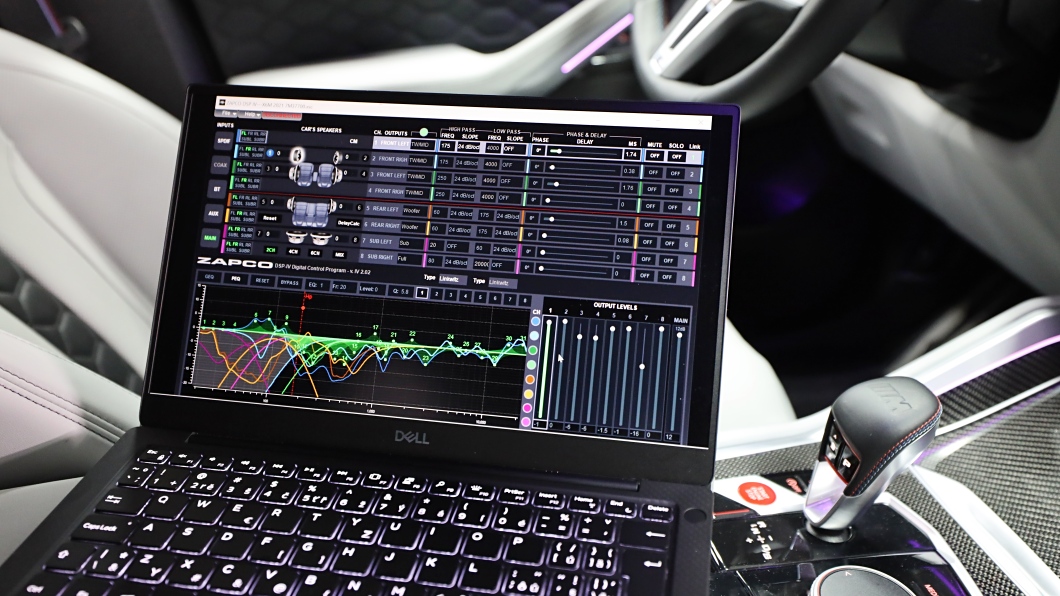 Druhou a stejně důležitou funkcí, kterou nám DSP procesor umožní, je úprava ekvalizační křivky reproduktoru. V programu každého DSP procesoru najdete ekvalizér s několika pásmy (10 pásem u základních procesorů a 30 a více u těch pokročilejších), které je možné detailně upravit. Běžný uživatel ekvalizér využije k drobnému doladění zvuku na základě svého ucha a osobních preferencí. Pro profesionála však začíná několikahodinová (pro audiofily i několikadenní) práce v podobě měření frekvenční odezvy reproduktorů a následného zapisování do programu DSP procesoru. Ptáte se proč? Interiér každého auta má zcela unikátní akustiku a není samozřejmě ideální pro poslech hudby. Proto je důležité změřit pomocí kalibrovaného mikrofonu všechny nežádoucí efekty a překážky, které vznikají při cestě zvuku do našeho ucha. Výslednou ekvalizační křivku každého reproduktoru ovlivňuje spousta faktorů jako je prostor za reproduktorem, materiál membrány i koše reproduktoru, ale i překážky zvuku jako jsou sedačky, středový tunel, volant nebo palubní deska. Je tedy nezbytné změřit frekvenční odezvu každého reproduktoru zvlášť a výsledky v podobě hodnot a úrovní jednotlivých frekvenčních pásem a poměru středních frekvencí k šířce pásma (Q) následně zapsat do programu DSP procesoru. Měříme opakovaně do té doby, dokud se nám nepovede získat lineární frekvenční odezvu reproduktorů, což zaručí dokonale věrný zvuk reprodutorů. Takových měření může být několik desítek, ale i stovek a jedná se tedy o velmi náročný úkon. A to nejen časově, ale i odborně. Proto je nezbytné, aby technik měl bohaté zkušenosti nejen s akustikou vozidel, ale i perfektní znalosti programu pro měření a analýzu zvuku a samozřejmě programu samotného DSP procesoru. V našich končinách bohužel tato služba není samozřejmostí a ačkoliv se několik společností chlubí schopnostmi práce s DSP procesory, přesto při nastavení zvuku neměří frekvenční odezvu reproduktorů. Což je pouze poloviční práce a výsledný zvuk je nesrovnatelný s poctivě nastaveným DSP procesorem se zohledněnými výsledky měření frekvenční odezvy každého reproduktoru. Na správně nastavený DSP procesor s frekvenčními křivkami jednotlivých reproduktorů se můžete podívat na fotografii výše a jen díky uvedenému postupu je možné i v tak akusticky náročném prostředí dosáhnout věrného a vysoce kvalitního zvuku. A to nejen se špičkovými a drahými reproduktory, ale i těmi základními za dostupnou cenu.