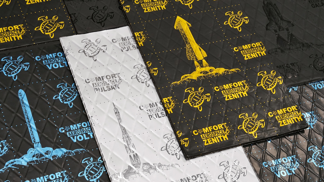 Moderní vibroakustické materiály Comfortmat Aerospace všechny pohromadě – Volt, Pulsar, Zenith a Galaxy.