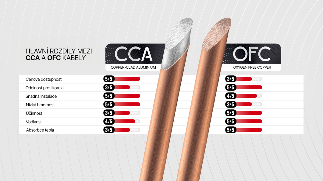 Na první pohled možná ne – ale na druhý poslech však ano. Rozdíly mezi OFC a CCA kabely se nejvíce projeví ve výkonu subwooferu, čistotě výšek a celkové dynamice zvuku. U CCA kabelu může docházet k úbytku napětí a tím i ke ztrátě výkonu zesilovače, což se projeví méně přesným přednesem, „měkčími“ basy a celkově nižší kontrolou nad reprodukcí.