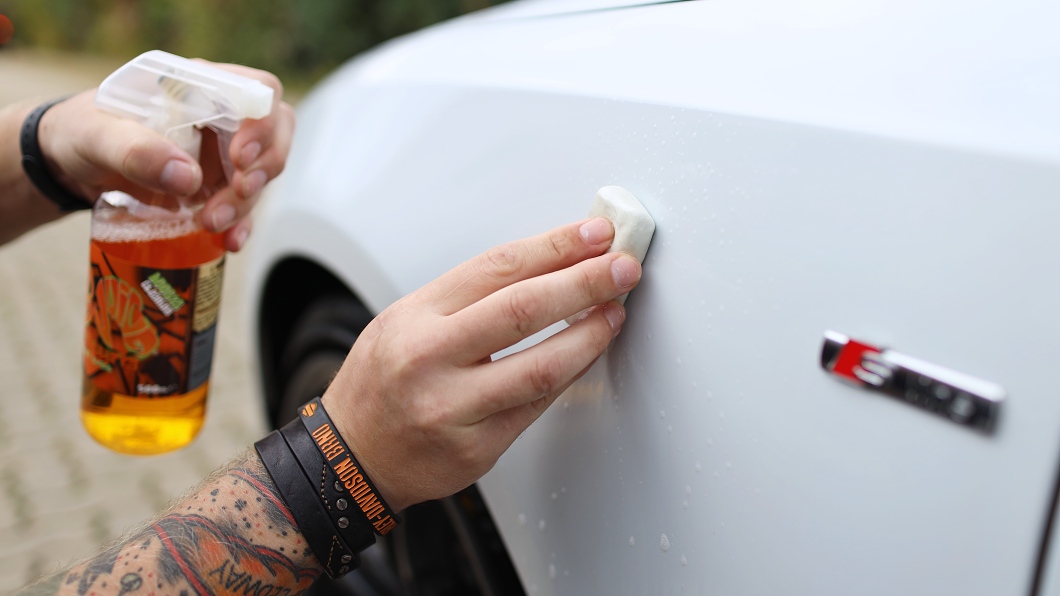 Druhá možnost jak dekontaminovat lak je mechanickou cestou a tou je tzv. clayování. Clay, v našem případě Infinity Wax Clay Bar Fine, je materiál podobný plastelíně, který zachytí veškeré nečistoty na laku auta. Tak jako u chemické dekontaminace, i pomocí clayování odstraníte polétavou rez, brzdový prach, asfalt, organický spad, prach, a další nečistoty. Claye se dělí na tvrdé, středně tvrdé a měkké. Tvrdé jsou účinnější, jejich nevýhodou ale může být velmi mírné a jemné poškození laku, kterému říkáme micro marring. Měkké claye jsou naopak šetrnější, ale méně účinné, více se s nimi tedy napracujete. I z těchto důvodů jsou nejpoužívanější středně tvrdé claye. Kromě claye budete potřebovat lubrikant, kterým rozhodně nešetřete. Díky němu bude clay klouzat po povrchu a minimalizuje se tak možné poškození laku. V Infinity Wax používají pro lubrikaci jejich Pure Shampoo, který je díky extrémním lubrikačním schopnostem vhodný i pro tyto účely. Postup je následující. Vezměte clay a oddělte menší část, ze které uděláte placku padnoucí akorát do ruky. Nastříkejte na clay i na lak lubrikant a můžete se do toho pustit. Jezděte po laku nahoru a dolů, pokud chcete tak doleva a doprava, stále lubrikujte a na clay netlačte. Takto postupujte po menších částech a ty vždy otřete utěrkou. Až bude lak perfektně hladký, tak máte hotovo. Clayování je účinnější než chemická dekontaminace a zbaví lak dokonale všech nečistot, ale má i své nevýhody. I ten nejměkčí clay může jemně poškodit lak, navíc je i fyzicky náročnější a může vám zabrat několik hodin. Ideální je však provést před nanesením ochrany jak chemickou, tak mechanickou dekontaminaci laku. Pokud se na clayování příliš necítíte, tak nezoufejte, dobrou službu odvede i odstraňovač polétavé rzi, eventuelně můžete postup zopakovat pro vyšší účinnost. A ještě jedna poznámka na závěr: pokud vám clay spadne na zem, vyhoďte jej. Když by se do něj usadili například drobné kamínky, můžete lak nenávratně poškodit. Máme tedy dekontaminováno, doporučujeme lak opět umýt a můžeme se pustit do leštění.