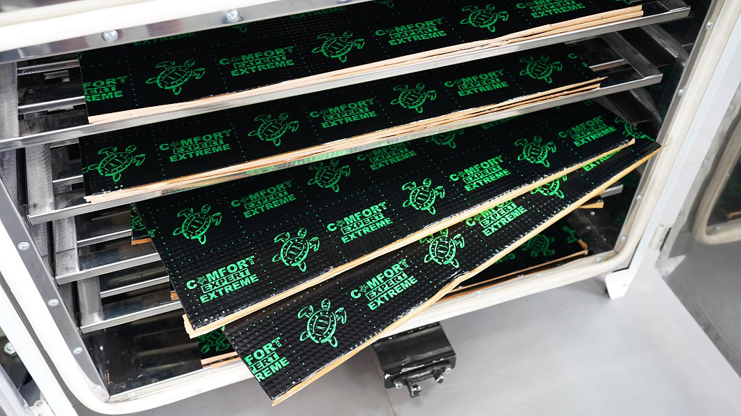 Vysoká účinnost antivibračních materiálů Comfortmat Atom a Extreme je vykoupena nutností tyto materiály zahřát na cca 55 až 60 stupňů. Bez zahřátí je prakticky nemožné s materiály pracovat a proto jsme u našeho odhlučnění volili spíše flexibilní materiály z modelové řady Dark. Nyní jsme však naši dílnu vybavili velkou průmyslovou pecí, která pojme až 50 kusů antivibračních materiálů a zahřeje je během několika minut na požadovanou teplotu. Díky tomu je s novými antivibračními materiály z modelové řady Expert snadné pracovat a tato pec nám umožnila výrazně zvýšit celkovou účinnost našeho odhlučnění. Po aplikaci materiál ztuhne na provozní teplotu a jeho účinnost je oproti běžným materiálům nepřekonatelná. V našich balíčcích odhlučnění Premium a Expert jsme se rozhodli pracovat při odhlučnění podlahy a zadních podběhů s antivibračním materiálem Comfortmat Atom. Ve vylepšených balíčcích Premium Plus a Expert Plus, které jsou zaměřeny na ještě vyšší účinnost, nově najdete na těchto oblastech Comfortmat Extreme. Práce s ním je i po zahřátí náročnější, přeci jen se jedná o nejúčinnější antivibrační materiál o této tloušťce na světě, nicméně složitější práce nám vůbec nevadí, když poté slyšíme od zákazníků nadšené ohlasy. Zvýšení účinnosti odhlučnění podlahy přináší i další benefit - již není nezbytné odhlučnit přední podběhy z vnější strany. Ze strany podlahy se totiž dostaneme až k palubní desce a tuto oblast odhlučníme kombinací vhodných materiálů tak účinně, že již není potřeba opatřit materiály i přední podběhy z vnější strany, kde je navíc výrazně menší plocha k aplikaci. Ušetříme tak hmotnost i čas a můžeme se důkladněji věnovat odhlučnění podlahy.