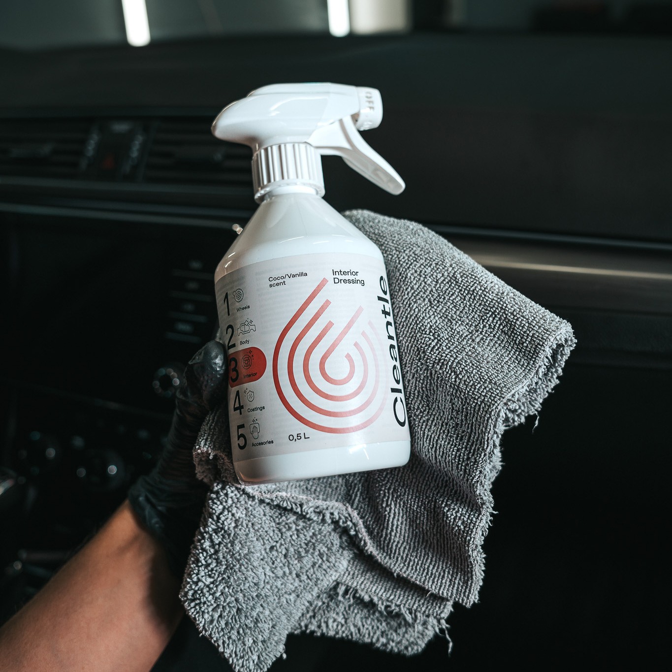 Cleantle Interior Dressing je produkt určený k ochraně a péči v interiéru vozidla, jako jsou plasty, vinyl, karbon nebo pryž. Obnovuje přirozený vzhled všech prvků, chrání je před vyblednutím a popraskáním. Díky receptuře na vodní bázi osvěží interiér bez zanechání šmouh či bílých stop, navíc má antistatické vlastnosti i příjemnou vůni, která vám umožní užívat si čistý a voňavý interiér po dlouhou dobu.