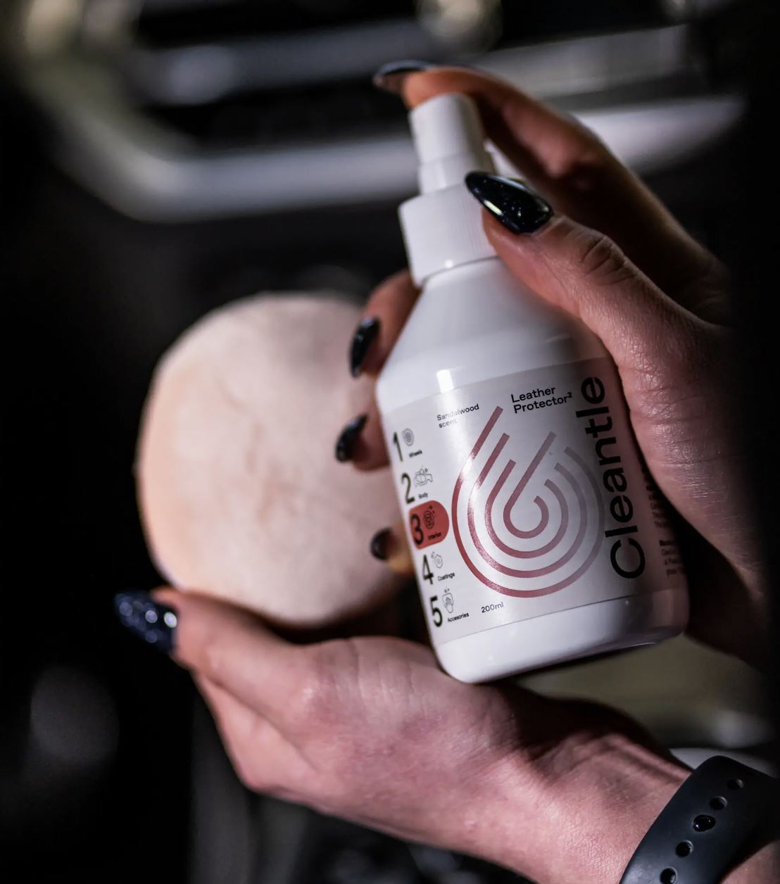 Cleantle Leather Protector² je určen k péči a ochraně koženého čalounění. Oddaluje zašpinění čalounění a činí povrch méně náchylným k zabarvení. Jeho složení je směsí polymerů a přírodních vosků, které kůži hydratují a vyživují. Po aplikaci povrch mírně ztmavne, klouže a je měkký na dotek. Výrobek obsahuje UV filtry, které chrání kůži před vyblednutím. S ohledem na bezpečnost uživatele a čalounění zajistili v Cleantle nejlepší možné složení produktu. Leather Protector² se skládá ze směsi polymerů a přírodních vosků, díky kterým produkt zanechává kožené čalounění dokonale vláčné a vyživené. Pro správnou aplikaci Leather Protector² musíte nejprve připravit povrch pro aplikaci. Vyplatí se sáhnout po Leather Cleaner² a efektivně vyčistit kožené čalounění pomocí profesionálního kartáče na kůži a látky. Přípravek aplikovaný na takový základ bude mít prodloužený účinek a efekt hydratovaného, ztmaveného a chráněného čalounění před špínou nebo UV zářením vám zůstane déle.