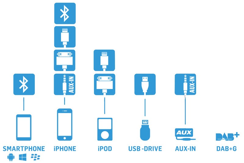 - iPod / iPhone vstup s nabíjením 1A (kabel pro připojení iPod/iPhone není součástí balení).