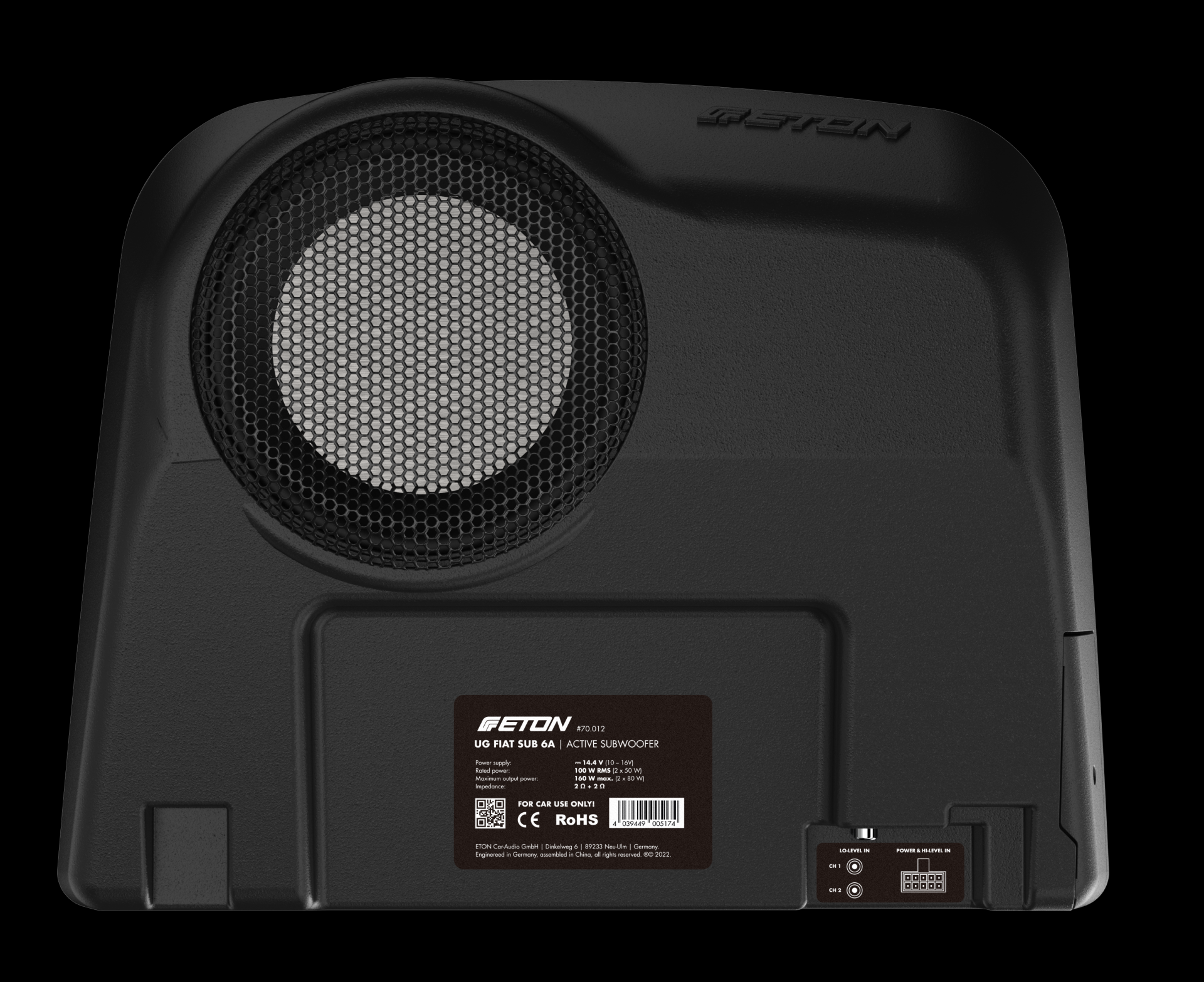 Aktivní subwoofer pro obytné vozy, kempingové a užitkové vozy: Plug & Play UG FIAT SUB 6A je kompatibilní s vozy Fiat Ducato III (řada 7 + 8), Peugeot Boxer II, Citroën Jumper II, Dodge Ram ProMaster a Iveco Daily (VI + VII). Aktivní basový box se snadno montuje a perfektně se vejde pod středovou konzolu ve vozidlech s držáky nápojů (bez indukční nabíjecí kolébky). Aktivní subwoofer má nově vyvinutý patentovaný kryt z tlakově litého hliníku. Speciální pevné hliníkové držáky umožňují snadnou montáž a demontáž basového boxu. 15 cm / 6“ woofer uvnitř basového boxu je efektivně poháněn integrovaným zesilovačem s výkonem 160 W: dostatečný výkon pro bohaté a výrazné basy – a to i ve větších vozidlech. Basový reproduktor je namontován podle principu downfire, tj. s reproduktorem směřujícím dolů, aby bylo umožněno optimální a rovnoměrné rozložení basových vln. Aktivní basový reproduktor je vybaven integrovaným nízkofrekvenčním filtrem 50 – 100 Hz a vstupem cinch (nízkoúrovňový vstup). Pro připojení k továrním rádiím bez výstupu REM je UG FIAT SUB 6A vybaven vysokoúrovňovým vstupem s funkcí automatického zapnutí (rozpoznání SIG).