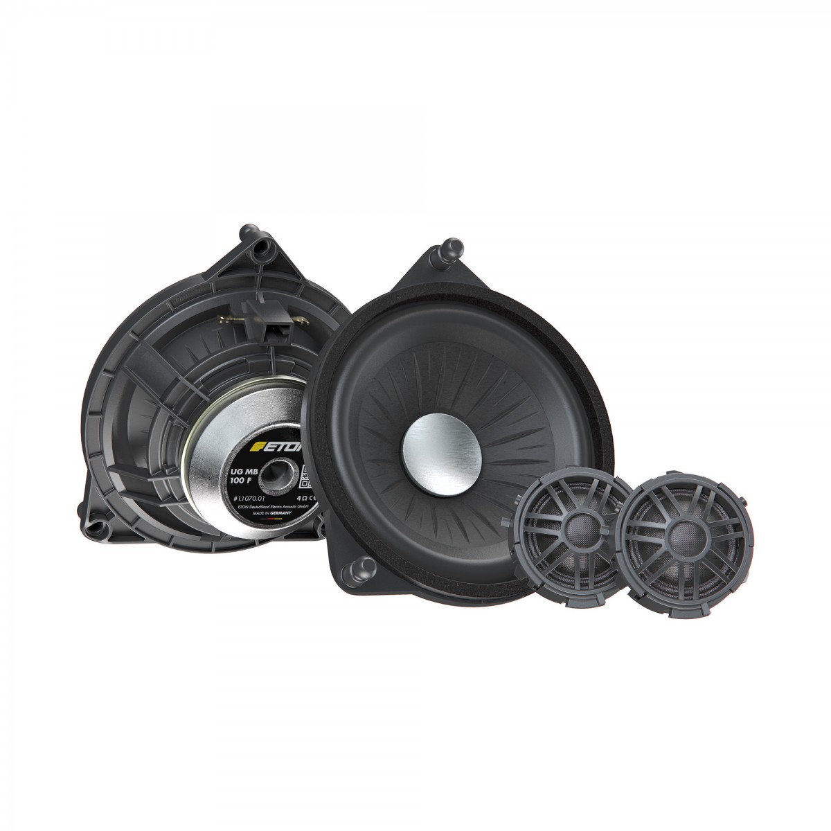 Špičkové 2pásmové 100mm komponentní Plug & Play reproduktory pro Mercedes-Benz. Reproduktory s žebrovanou a impregnovanou papírovou membránou a špičkovým 25mm výškovým reproduktorem jsou určené pro přední dveře nových modelů Mercedes-Benz. Připojení pomocí originálních konektorů Mercedes, není třeba žádné jiné konektory dokupovat. Koš středobasů je vyroben ze speciálního tvrzeného polykarbonátu. Součástí balení jsou i malé frekvenční výhybky. Vývoj a výroba Made in Germany.