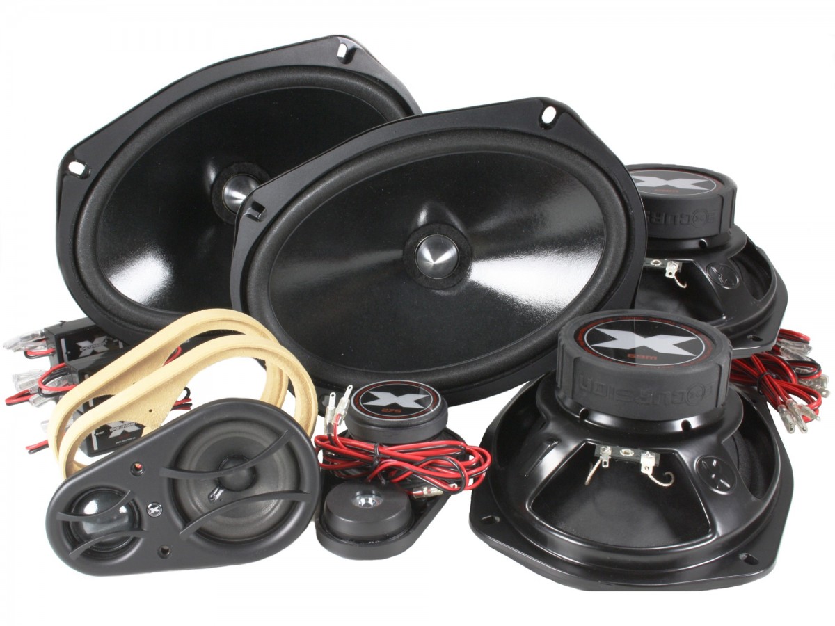 | Typ reproduktorůKoaxiální reproduktory: Koaxiální reproduktory se vyznačují konstrukcí tzv. vše v jednom. Výškový a středobasový reproduktor jsou v jednom koši. Výhodou je jednodušší montáž, ale díky spojení resp. blízkosti pásem v jednom reproduktoru, se obvykle sníží kvalita zvuku. Zpravidla uprostřed středobasového reproduktoru, je výškový reproduktor, jehož kmitací cívka pracuje ve druhé vzduchové mezeře společného magnatického obvodu. Třípásmový koaxiální reproduktor se skládá ze středobasového reproduktoru, ve předu na zvláštním nosníku je středový reproduktor a samostatný výškový. Komponentní reproduktory: Komponentní reproduktory se vyznačují rozdělením na jednotlivá frekvenční pásma, výškové + středobasové + popř. basové pásmo. Jednotlivé reproduktory se dají umístit zcela odděleně, což má za výsledek lepší zvukový i akustický projev. V drtivé většině případů komponentních reproduktorů je dodávaná i externí výhybka, která rozděluje výškové, středové / středobasové a u třípásma i basové pásmo popř. umožňuje nastavení decibelové úrovně u výškového reproduktoru (např. +2 dB, 0 dB, -2 dB), strmosti (např. 6dB/Okt. 12dB/Okt.) či aktivní nebo bi-amp zapojení. | Komponentní 3 pásmové |