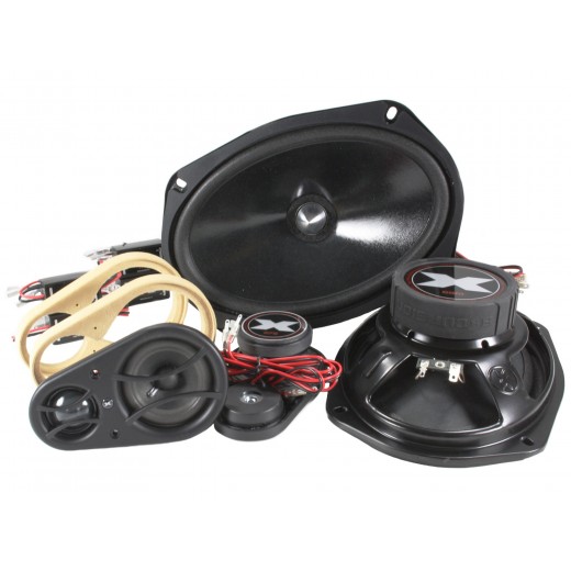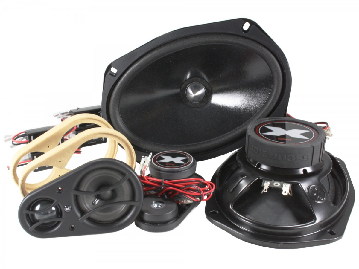 | Typ reproduktorůKoaxiální reproduktory: Koaxiální reproduktory se vyznačují konstrukcí tzv. vše v jednom. Výškový a středobasový reproduktor jsou v jednom koši. Výhodou je jednodušší montáž, ale díky spojení resp. blízkosti pásem v jednom reproduktoru, se obvykle sníží kvalita zvuku. Zpravidla uprostřed středobasového reproduktoru, je výškový reproduktor, jehož kmitací cívka pracuje ve druhé vzduchové mezeře společného magnatického obvodu. Třípásmový koaxiální reproduktor se skládá ze středobasového reproduktoru, ve předu na zvláštním nosníku je středový reproduktor a samostatný výškový. Komponentní reproduktory: Komponentní reproduktory se vyznačují rozdělením na jednotlivá frekvenční pásma, výškové + středobasové + popř. basové pásmo. Jednotlivé reproduktory se dají umístit zcela odděleně, což má za výsledek lepší zvukový i akustický projev. V drtivé většině případů komponentních reproduktorů je dodávaná i externí výhybka, která rozděluje výškové, středové / středobasové a u třípásma i basové pásmo popř. umožňuje nastavení decibelové úrovně u výškového reproduktoru (např. +2 dB, 0 dB, -2 dB), strmosti (např. 6dB/Okt. 12dB/Okt.) či aktivní nebo bi-amp zapojení. | Komponentní 3 pásmové |