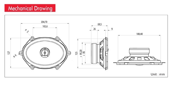 | Montážní hloubka středobasového reproduktoruMontážní hloubka reproduktoru se měří od nejspodnější hrany magnetu až po spodní okraj plechového, plastového nebo litého koše reproduktoru, resp. dosedací plochy reproduktoru. | 69,5 mm |