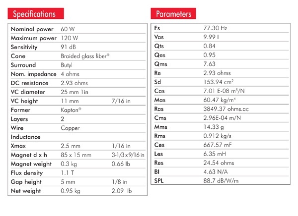 | Citlivost (2,83V/1m)Citlivost, senzitivita neboli účinnost reproduktoru. Citlivost reproduktorů se udává v decibelech (dB) a zjednodušeně řečeno znamená, čím vyšší hodnota, tím menší nároky na výkon zesilovače. Jedná se defacto o hodnocení, jak reproduktor převádí watty na zvuk. Hodnocení citlivosti jsou v úrovní hluku měřené na 1 metr od reproduktoru pomocí 1 W (watt energie) nebo pomocí 2,83 voltu na zdroji na 1 metr. Vyšší decibelová úroveň znamená, že reproduktor je hlasitější s nižším výkonem. Pro každý nárůst o 3 dB citlivosti, reproduktor vyžaduje poloviční sílu pro reprodukci stejné hlasitosti. Například, pokud 88 dB reproduktor potřebuje 100 Wattů k výrobě určité hlasitosti, pak reproduktor s 91dB citlivostí potřebuje jen 50 wattů, aby se dostal na stejnou hlasitost. | 88,6 dB |