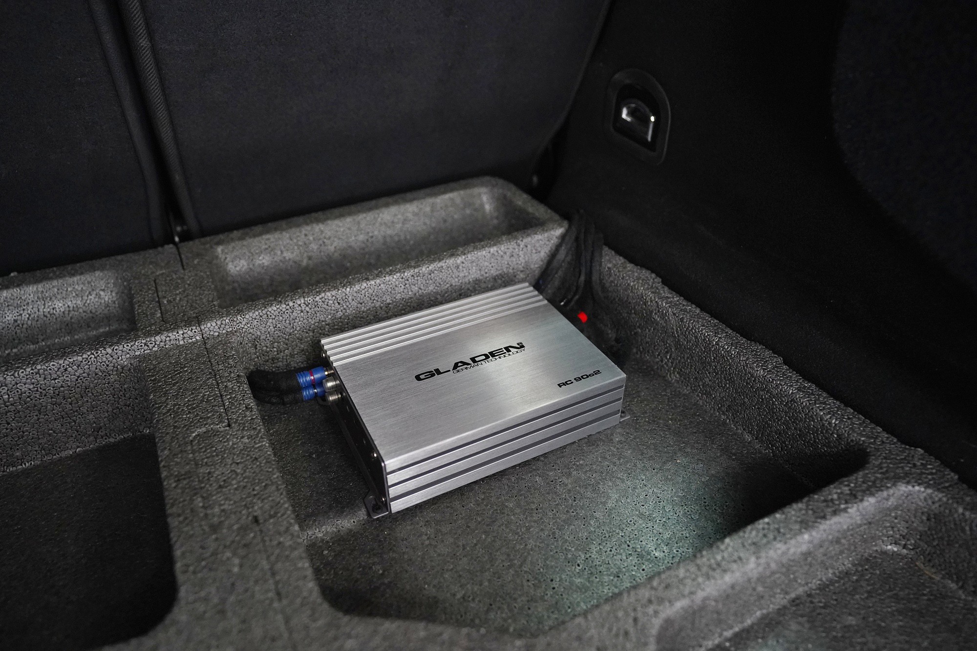 V pravém horním rohu můžete vidět zesilovač německého výrobce Gladen, který jsme umístili do dvojitého dna zavazadlového prostoru a ve finální podobě bude tedy zcela skrytý. Díky výkonu 1x 260 W RMS v můstku se tento zesilovač perfektně hodí pro daný subwoofer.