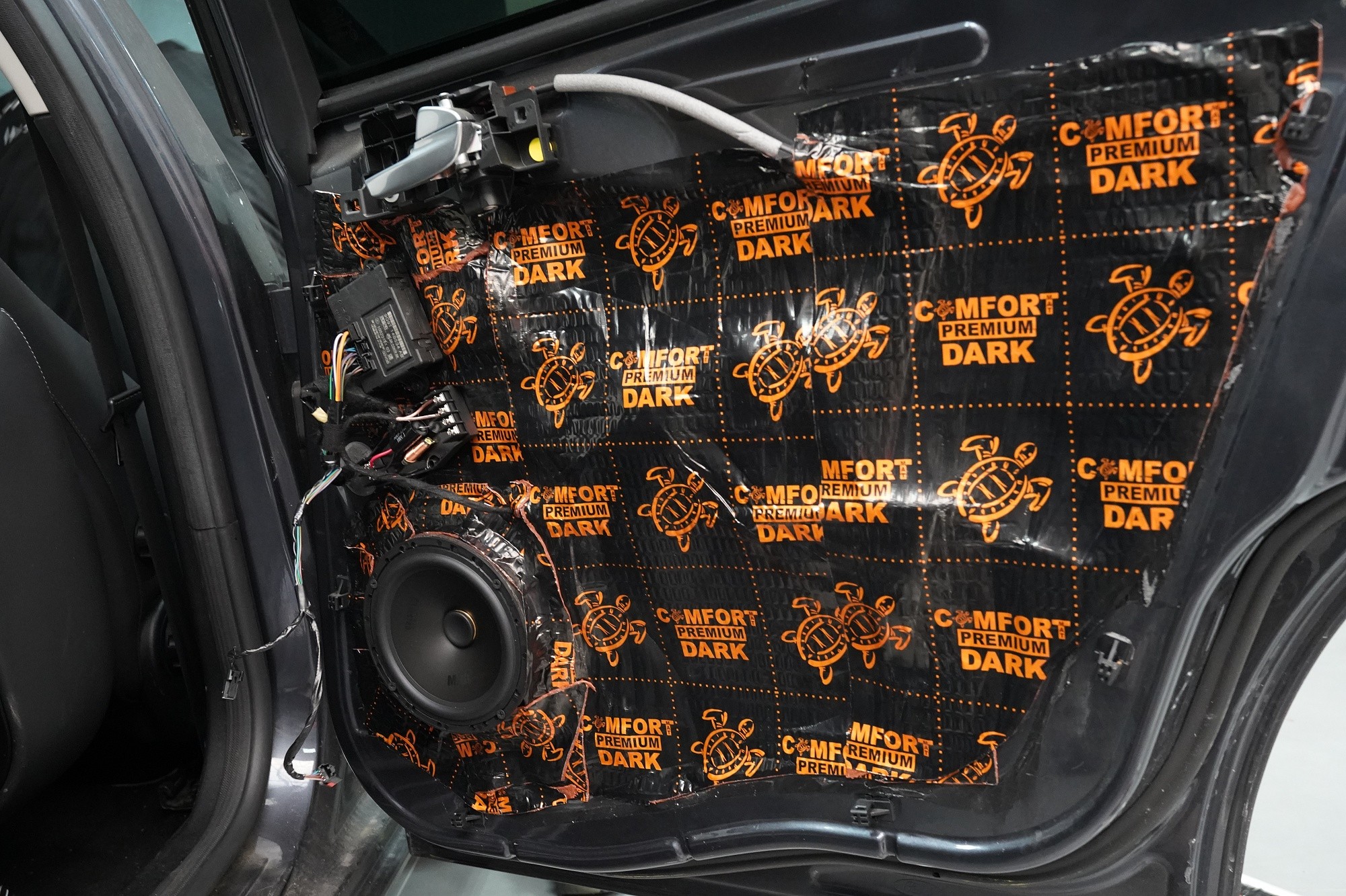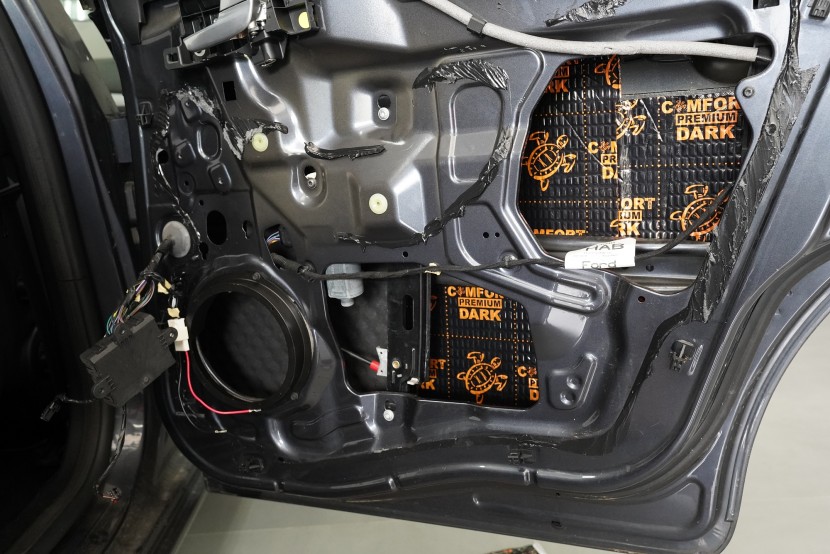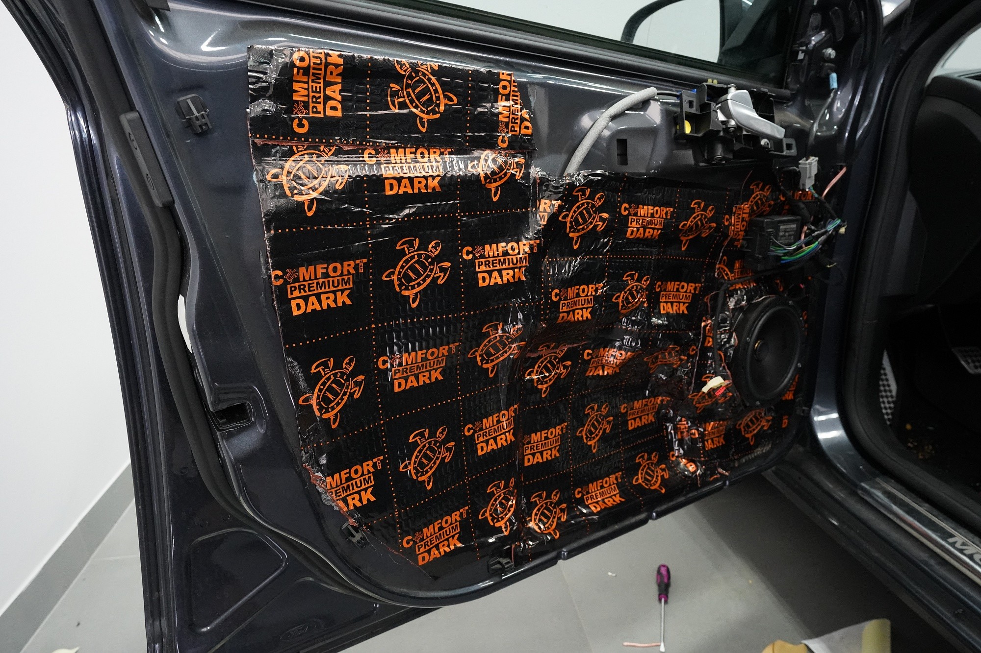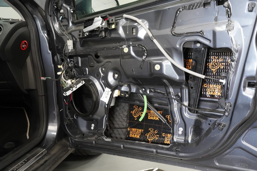 Důležitou součástí instalace je tlumení dveří, které má za následek výrazně zlepšení zvuku středobasových reproduktorů a to zejména jejich basové složky. První vrstvou je antivibrační materiál Comfortmat D2, který vnější plech dveří zpevní a zamezí vibracím. Jedná se o prémiový a velmi lehký materiál, který zbytečně nezatěžuje dveře, je absolutně voděodolný a mimo jiné má i antikorozní vlastnosti. Pouze za reproduktor následně lepíme materiál Comfortmat Tsunami, který má jednu velmi zajímavou funkci a to absorpci stojatého vlnění za středobasovým reproduktorem. Díky tomu se zvuk neodráží od plechu dveří, ale je pohlcen materiálem, což samozřejmě vede ke zlepšení zvuku. I Comfortmat Tsunami je zcela voděodolný, nenasává vlhkost a díky extrémně přilnavé vrstvě nehrozí jeho odlepení.