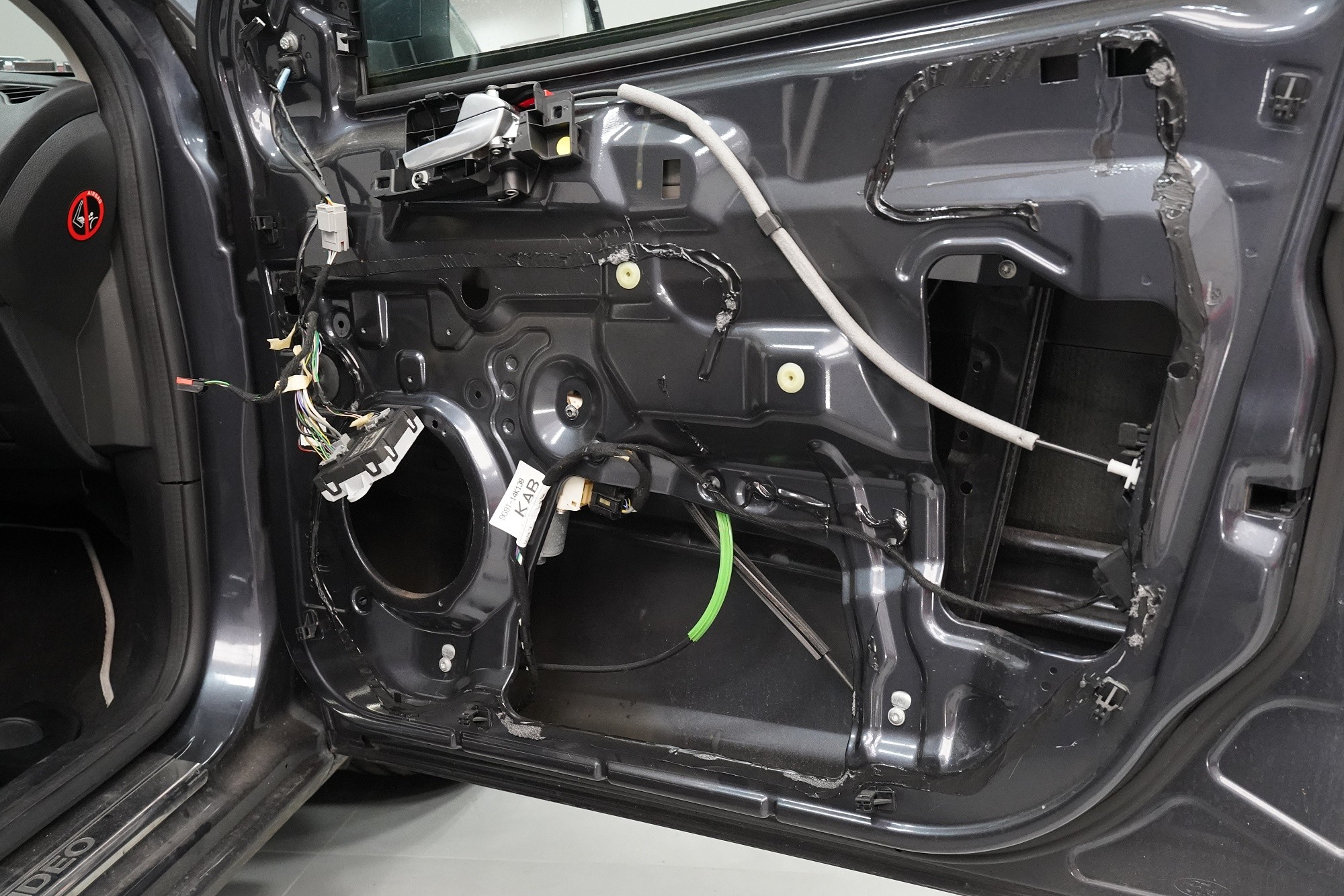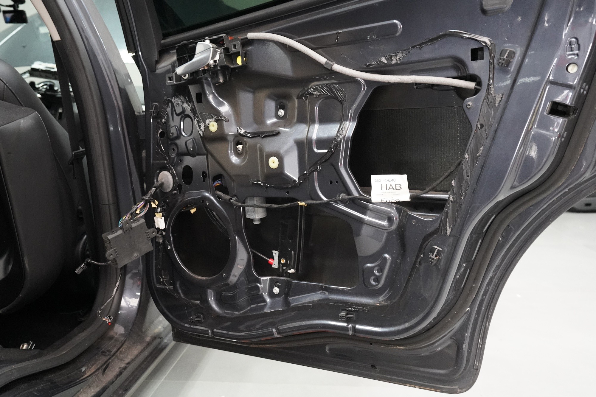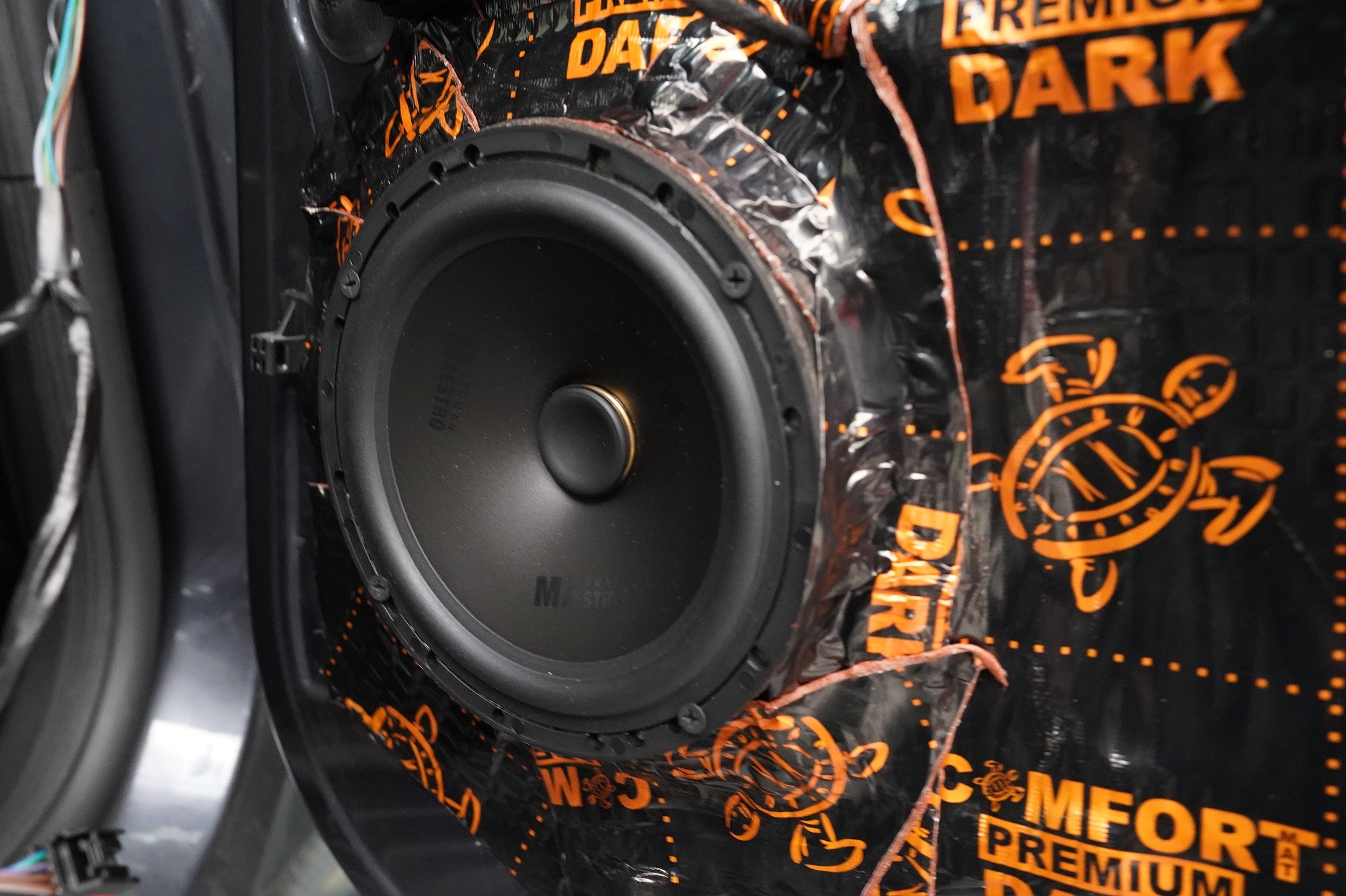 Důležitou součástí instalace je tlumení dveří, které má za následek výrazně zlepšení zvuku středobasových reproduktorů a to zejména jejich basové složky. První vrstvou je antivibrační materiál Comfortmat D2, který vnější plech dveří zpevní a zamezí vibracím. Jedná se o prémiový a velmi lehký materiál, který zbytečně nezatěžuje dveře, je absolutně voděodolný a mimo jiné má i antikorozní vlastnosti. Pouze za reproduktor následně lepíme materiál Comfortmat Tsunami, který má jednu velmi zajímavou funkci a to absorpci stojatého vlnění za středobasovým reproduktorem. Díky tomu se zvuk neodráží od plechu dveří, ale je pohlcen materiálem, což samozřejmě vede ke zlepšení zvuku. I Comfortmat Tsunami je zcela voděodolný, nenasává vlhkost a díky extrémně přilnavé vrstvě nehrozí jeho odlepení.