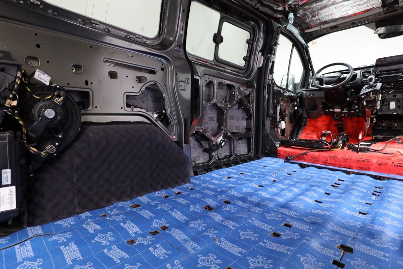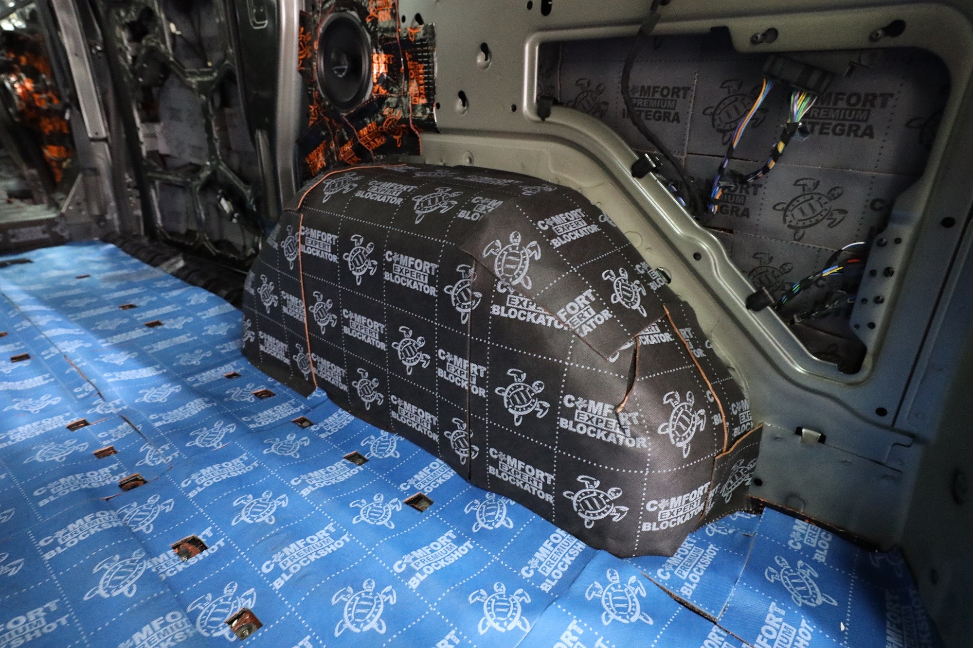 U zadní části podlahy postupujeme u druhé vrstvy opět odlišným způsobem a volíme modrý zvukově izolační materiál Comfortmat Blockshot. Ten již obsahuje protihlukovou membránu o tloušťce 2 mm a jedná se tedy o vrstvu finální díky vysoké účinnosti se schopností zvukové izolace až 32 dB. Na zadní podběhy, které jsou nejvíce zatíženy hlukem i vibracemi lepíme kombinaci materiálu Comfortmat Soft Wave a Blockator.