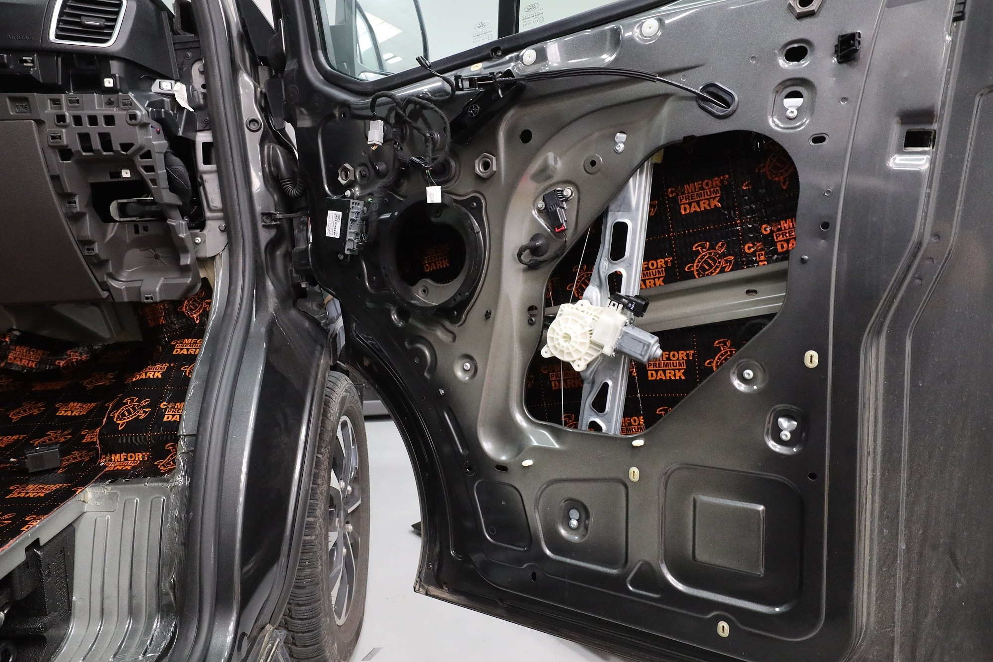 V rámci balíčku Expert Plus volíme silnější antivibrační materiál i na vnější plech dveří, tedy Comfortmat Dark D3 o tloušťce 3 mm. Ten s přehledem zlikviduje vibrace, zamezí pronikání nízkofrekvenčního hluku a zpevní velmi tenký plech dveří. I přes vyšší tloušťku materiál disponuje velmi nízkou hmotností, je samozřejmě voděodolný a má mimo jiné antikorozní vlastnosti.