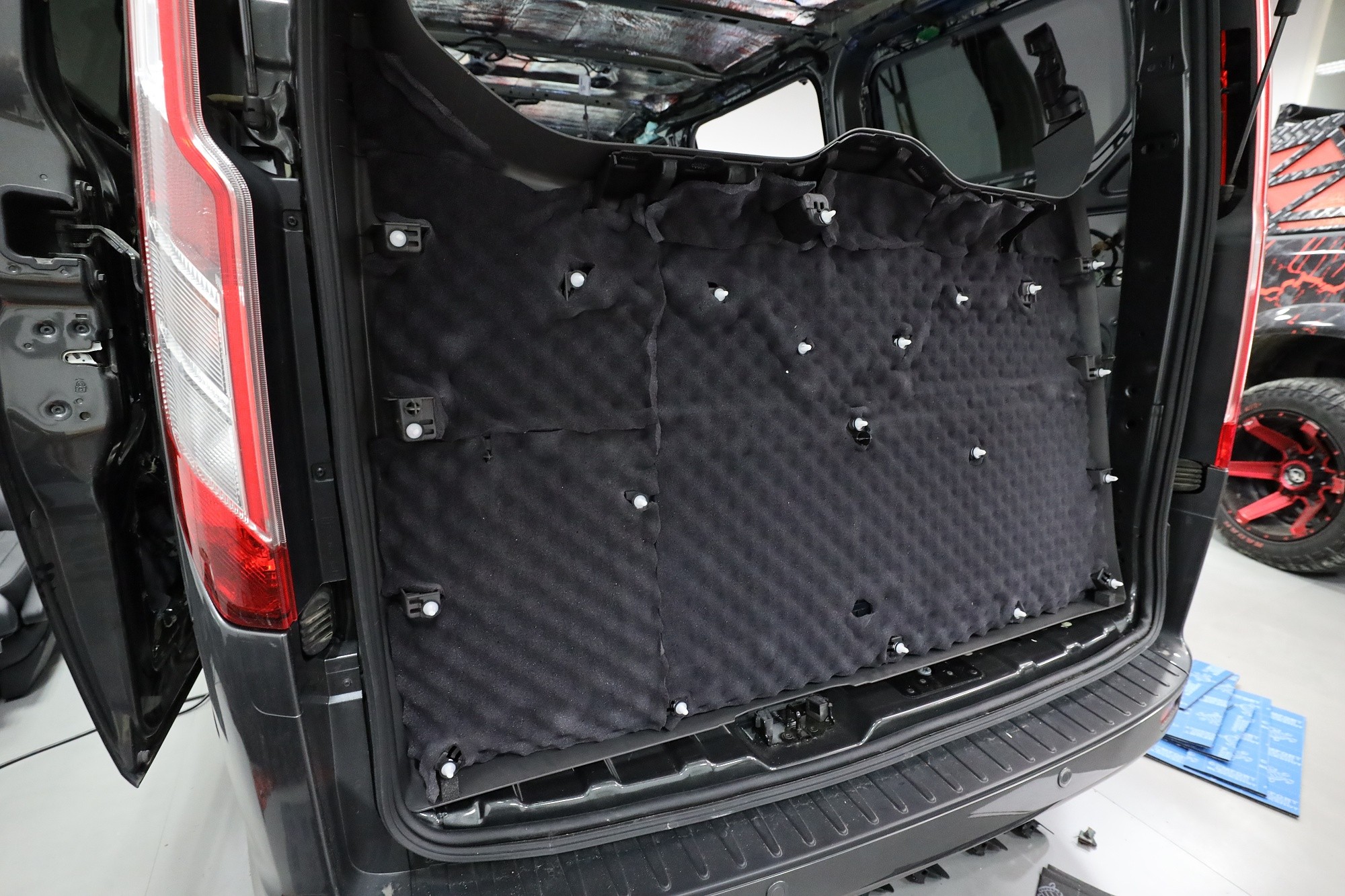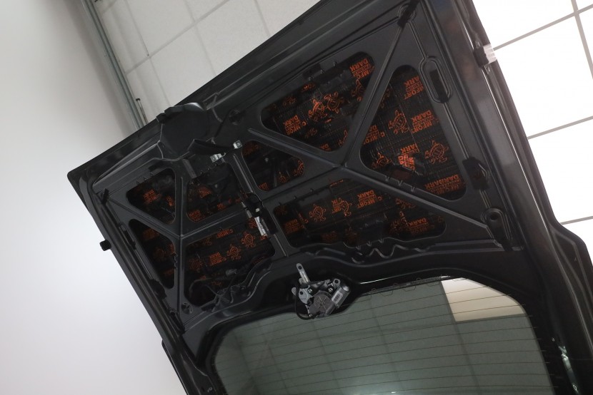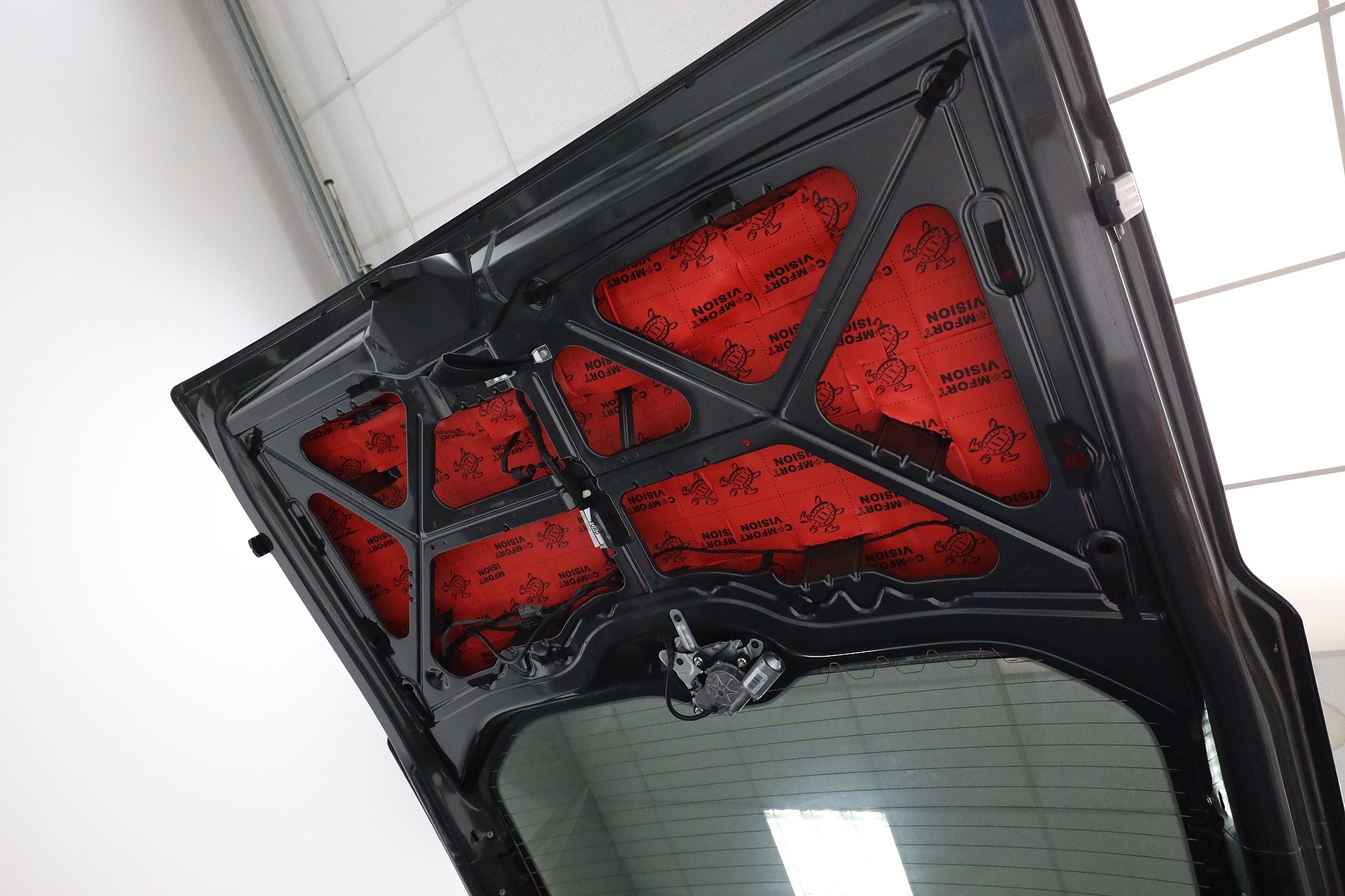 Věnujeme se samozřejmě i pátým dveřím, aby odhlučnění zavazadlového prostoru bylo kompletní. Jako první vrstvu volíme lehký antivibrační materiál Comfortmat Dark D2 o tloušťce 2,3 mm, který zamezí vibracím a nezatěžuje páté dveře zbytečnou hmotností.