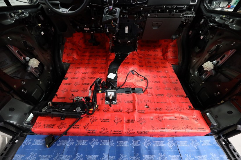 Začínáme přední částí podlahy, na kterou jsme v první vrstvě aplikovali antivibrační materiál Comfortmat D4 o tloušťce 4 mm a akustickým ztrátovým činitelem (MLF) o hodnotě 0,49 jednotek. D4 s přehledem odfiltruje vibrace této oblasti od motoru, převodovky nebo zavěšení kol a eliminuje pronikání nízkofrekvenčního hluku. Všimněte si, že materiál aplikujeme po celé ploše až k palubní desce a tím důkladně odhlučníme i přední podběhy z vnitřní strany, ze které je přístup na mnohem větší plochu. Hluk od pneumatik bude mít velký problém s překonáním této bariéry!