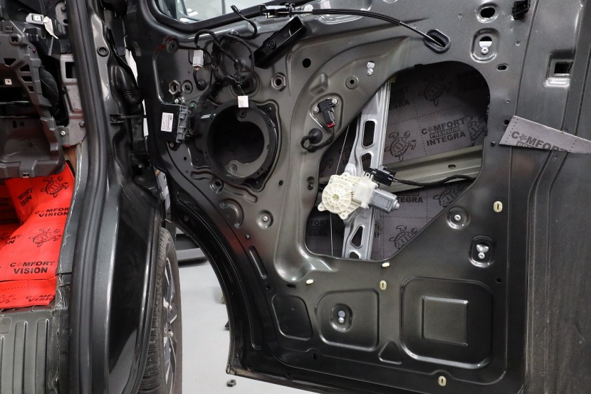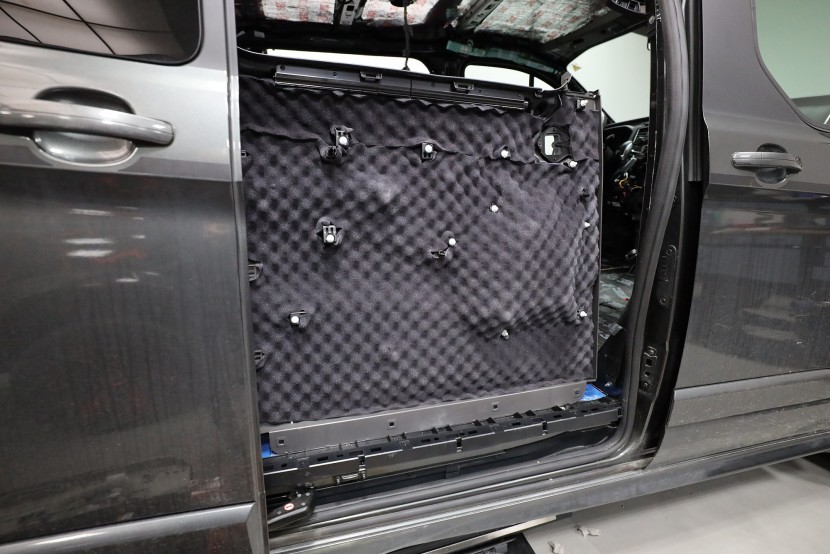 Poslední vrstvou je Comfortmat Softwave o tloušťce 15 mm. Tato flexibilní pěna s tvarovou pamětí se lepí na plastové čalounění dveří z důvodu zamezení skřípání a vrzání nejen plastů, ale i drátů a dalších komponent uvnitř dveří a dodatečně i sníží hluk této oblasti. Stejný postup volíme i u bočních dveří a dalších plastů interiéru.