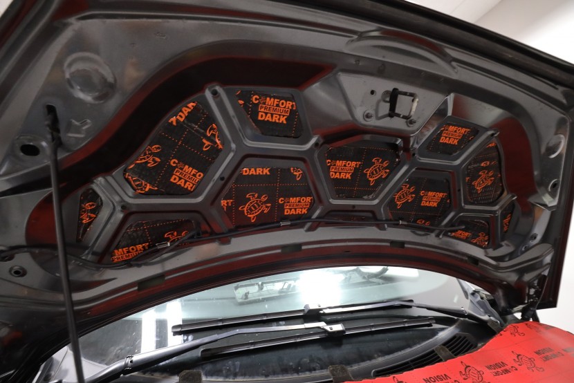 Nezapomínáme ani na kapotu, na kterou v první vrstvě aplikujeme opět lehký antivibrační materiál Comfortmat D2. Tím kapotu zpevníme, zamezíme vibracím, které se přenáší do dalších částí vozu a zmizí i typický plechový zvuk při zavření kapoty. Na originální kryt kapoty následně aplikujeme zvukově i tepelně izolační materiál Comfortmat Vision, který sníží hluk motoru a to při zachování původního vzhledu motorového prostoru.