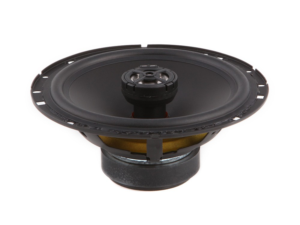 | Typ reproduktorůKoaxiální reproduktory: Koaxiální reproduktory se vyznačují konstrukcí tzv. vše v jednom. Výškový a středobasový reproduktor jsou v jednom koši. Výhodou je jednodušší montáž, ale díky spojení resp. blízkosti pásem v jednom reproduktoru, se obvykle sníží kvalita zvuku. Zpravidla uprostřed středobasového reproduktoru, je výškový reproduktor, jehož kmitací cívka pracuje ve druhé vzduchové mezeře společného magnatického obvodu. Třípásmový koaxiální reproduktor se skládá ze středobasového reproduktoru, ve předu na zvláštním nosníku je středový reproduktor a samostatný výškový. Komponentní reproduktory: Komponentní reproduktory se vyznačují rozdělením na jednotlivá frekvenční pásma, výškové + středobasové + popř. basové pásmo. Jednotlivé reproduktory se dají umístit zcela odděleně, což má za výsledek lepší zvukový i akustický projev. V drtivé většině případů komponentních reproduktorů je dodávaná i externí výhybka, která rozděluje výškové, středové / středobasové a u třípásma i basové pásmo popř. umožňuje nastavení decibelové úrovně u výškového reproduktoru (např. +2 dB, 0 dB, -2 dB), strmosti (např. 6dB/Okt. 12dB/Okt.) či aktivní nebo bi-amp zapojení. | Koaxiální 2 pásmové |