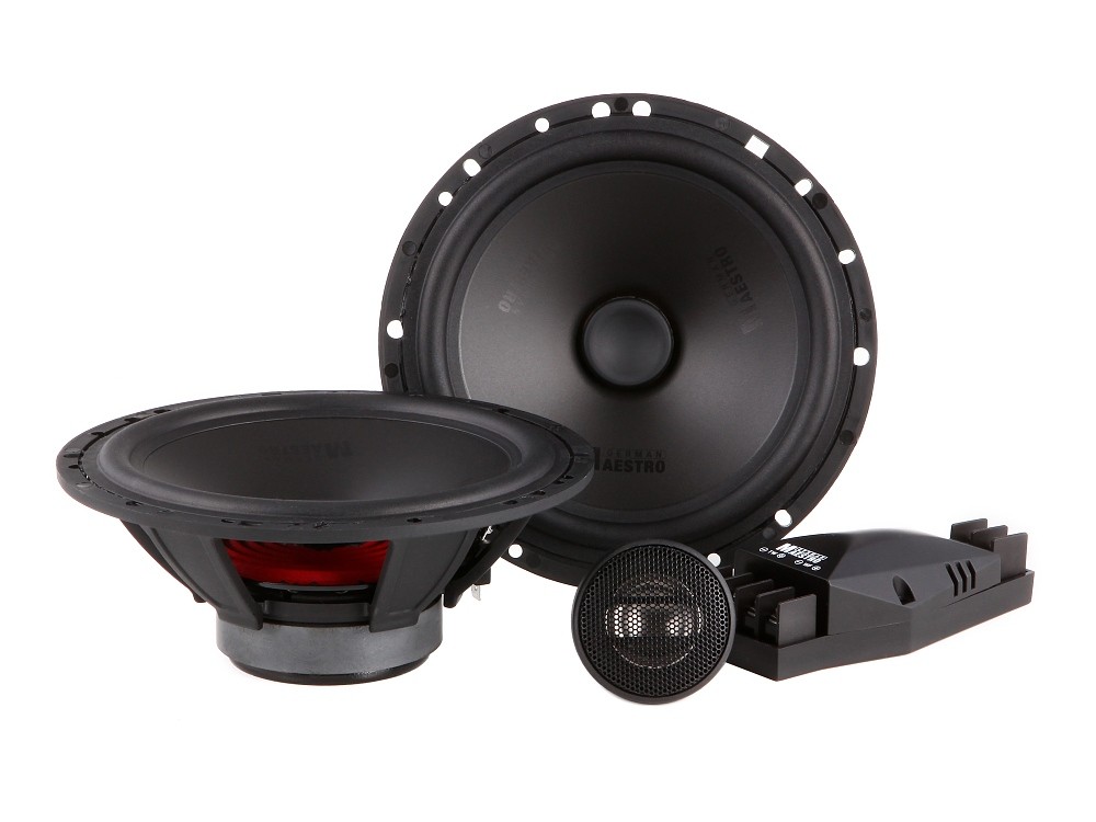 | Typ reproduktorůKoaxiální reproduktory: Koaxiální reproduktory se vyznačují konstrukcí tzv. vše v jednom. Výškový a středobasový reproduktor jsou v jednom koši. Výhodou je jednodušší montáž, ale díky spojení resp. blízkosti pásem v jednom reproduktoru, se obvykle sníží kvalita zvuku. Zpravidla uprostřed středobasového reproduktoru, je výškový reproduktor, jehož kmitací cívka pracuje ve druhé vzduchové mezeře společného magnatického obvodu. Třípásmový koaxiální reproduktor se skládá ze středobasového reproduktoru, ve předu na zvláštním nosníku je středový reproduktor a samostatný výškový. Komponentní reproduktory: Komponentní reproduktory se vyznačují rozdělením na jednotlivá frekvenční pásma, výškové + středobasové + popř. basové pásmo. Jednotlivé reproduktory se dají umístit zcela odděleně, což má za výsledek lepší zvukový i akustický projev. V drtivé většině případů komponentních reproduktorů je dodávaná i externí výhybka, která rozděluje výškové, středové / středobasové a u třípásma i basové pásmo popř. umožňuje nastavení decibelové úrovně u výškového reproduktoru (např. +2 dB, 0 dB, -2 dB), strmosti (např. 6dB/Okt. 12dB/Okt.) či aktivní nebo bi-amp zapojení. | Komponentní 2 pásmové |