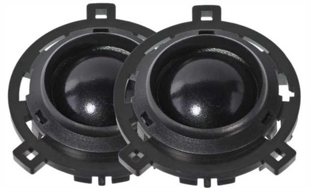 | Typ reproduktorůKoaxiální reproduktory: Koaxiální reproduktory se vyznačují konstrukcí tzv. vše v jednom. Výškový a středobasový reproduktor jsou v jednom koši. Výhodou je jednodušší montáž, ale díky spojení resp. blízkosti pásem v jednom reproduktoru, se obvykle sníží kvalita zvuku. Zpravidla uprostřed středobasového reproduktoru, je výškový reproduktor, jehož kmitací cívka pracuje ve druhé vzduchové mezeře společného magnatického obvodu. Třípásmový koaxiální reproduktor se skládá ze středobasového reproduktoru, ve předu na zvláštním nosníku je středový reproduktor a samostatný výškový. Komponentní reproduktory: Komponentní reproduktory se vyznačují rozdělením na jednotlivá frekvenční pásma, výškové + středobasové + popř. basové pásmo. Jednotlivé reproduktory se dají umístit zcela odděleně, což má za výsledek lepší zvukový i akustický projev. V drtivé většině případů komponentních reproduktorů je dodávaná i externí výhybka, která rozděluje výškové, středové / středobasové a u třípásma i basové pásmo popř. umožňuje nastavení decibelové úrovně u výškového reproduktoru (např. +2 dB, 0 dB, -2 dB), strmosti (např. 6dB/Okt. 12dB/Okt.) či aktivní nebo bi-amp zapojení. | Výškové |