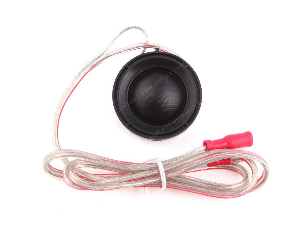 | Typ reproduktorůKoaxiální reproduktory: Koaxiální reproduktory se vyznačují konstrukcí tzv. vše v jednom. Výškový a středobasový reproduktor jsou v jednom koši. Výhodou je jednodušší montáž, ale díky spojení resp. blízkosti pásem v jednom reproduktoru, se obvykle sníží kvalita zvuku. Zpravidla uprostřed středobasového reproduktoru, je výškový reproduktor, jehož kmitací cívka pracuje ve druhé vzduchové mezeře společného magnatického obvodu. Třípásmový koaxiální reproduktor se skládá ze středobasového reproduktoru, ve předu na zvláštním nosníku je středový reproduktor a samostatný výškový. Komponentní reproduktory: Komponentní reproduktory se vyznačují rozdělením na jednotlivá frekvenční pásma, výškové + středobasové + popř. basové pásmo. Jednotlivé reproduktory se dají umístit zcela odděleně, což má za výsledek lepší zvukový i akustický projev. V drtivé většině případů komponentních reproduktorů je dodávaná i externí výhybka, která rozděluje výškové, středové / středobasové a u třípásma i basové pásmo popř. umožňuje nastavení decibelové úrovně u výškového reproduktoru (např. +2 dB, 0 dB, -2 dB), strmosti (např. 6dB/Okt. 12dB/Okt.) či aktivní nebo bi-amp zapojení. | Výškové |