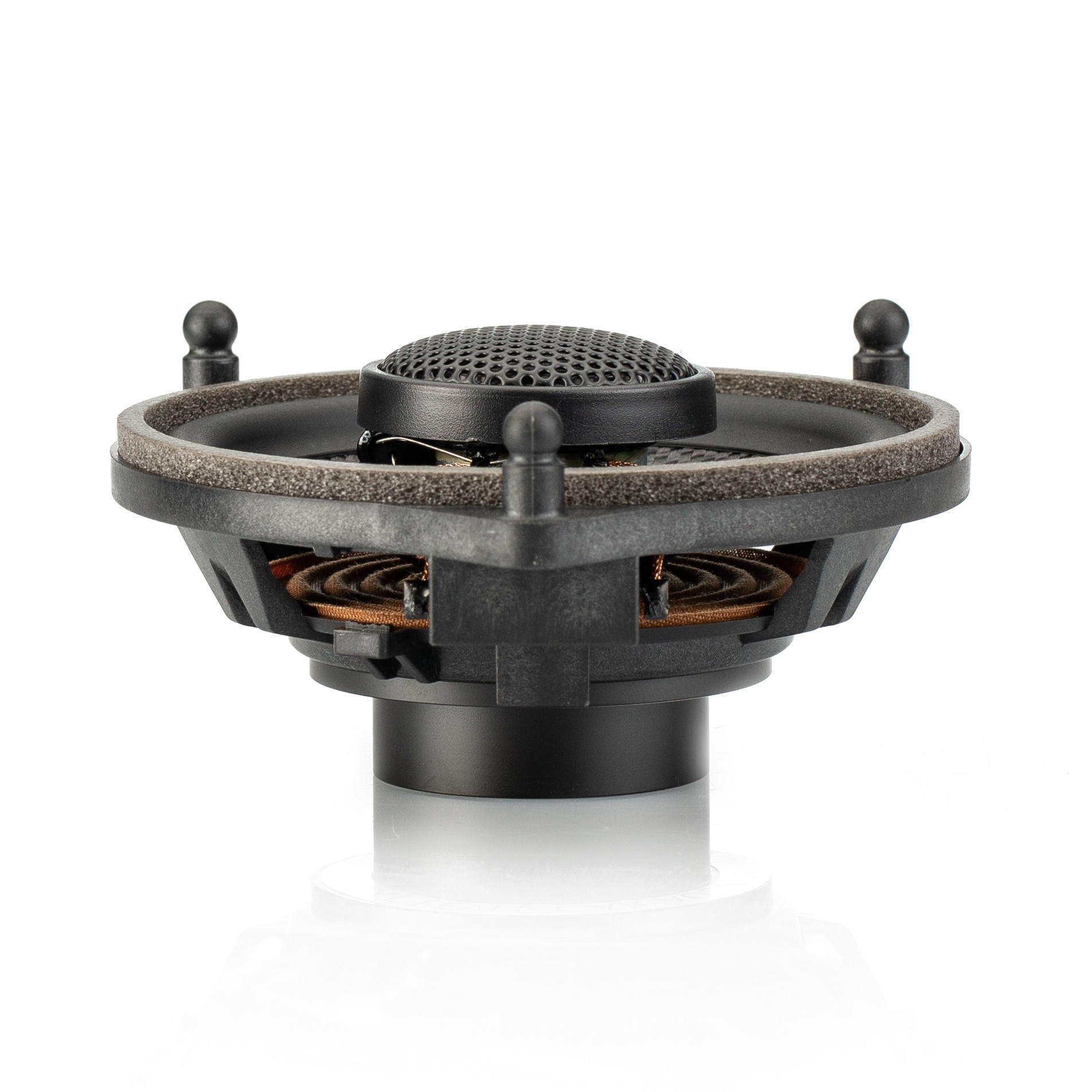 | Typ reproduktorůKoaxiální reproduktory: Koaxiální reproduktory se vyznačují konstrukcí tzv. vše v jednom. Výškový a středobasový reproduktor jsou v jednom koši. Výhodou je jednodušší montáž, ale díky spojení resp. blízkosti pásem v jednom reproduktoru, se obvykle sníží kvalita zvuku. Zpravidla uprostřed středobasového reproduktoru, je výškový reproduktor, jehož kmitací cívka pracuje ve druhé vzduchové mezeře společného magnatického obvodu. Třípásmový koaxiální reproduktor se skládá ze středobasového reproduktoru, ve předu na zvláštním nosníku je středový reproduktor a samostatný výškový. Komponentní reproduktory: Komponentní reproduktory se vyznačují rozdělením na jednotlivá frekvenční pásma, výškové + středobasové + popř. basové pásmo. Jednotlivé reproduktory se dají umístit zcela odděleně, což má za výsledek lepší zvukový i akustický projev. V drtivé většině případů komponentních reproduktorů je dodávaná i externí výhybka, která rozděluje výškové, středové / středobasové a u třípásma i basové pásmo popř. umožňuje nastavení decibelové úrovně u výškového reproduktoru (např. +2 dB, 0 dB, -2 dB), strmosti (např. 6dB/Okt. 12dB/Okt.) či aktivní nebo bi-amp zapojení. | Koaxiální 2pásmové |