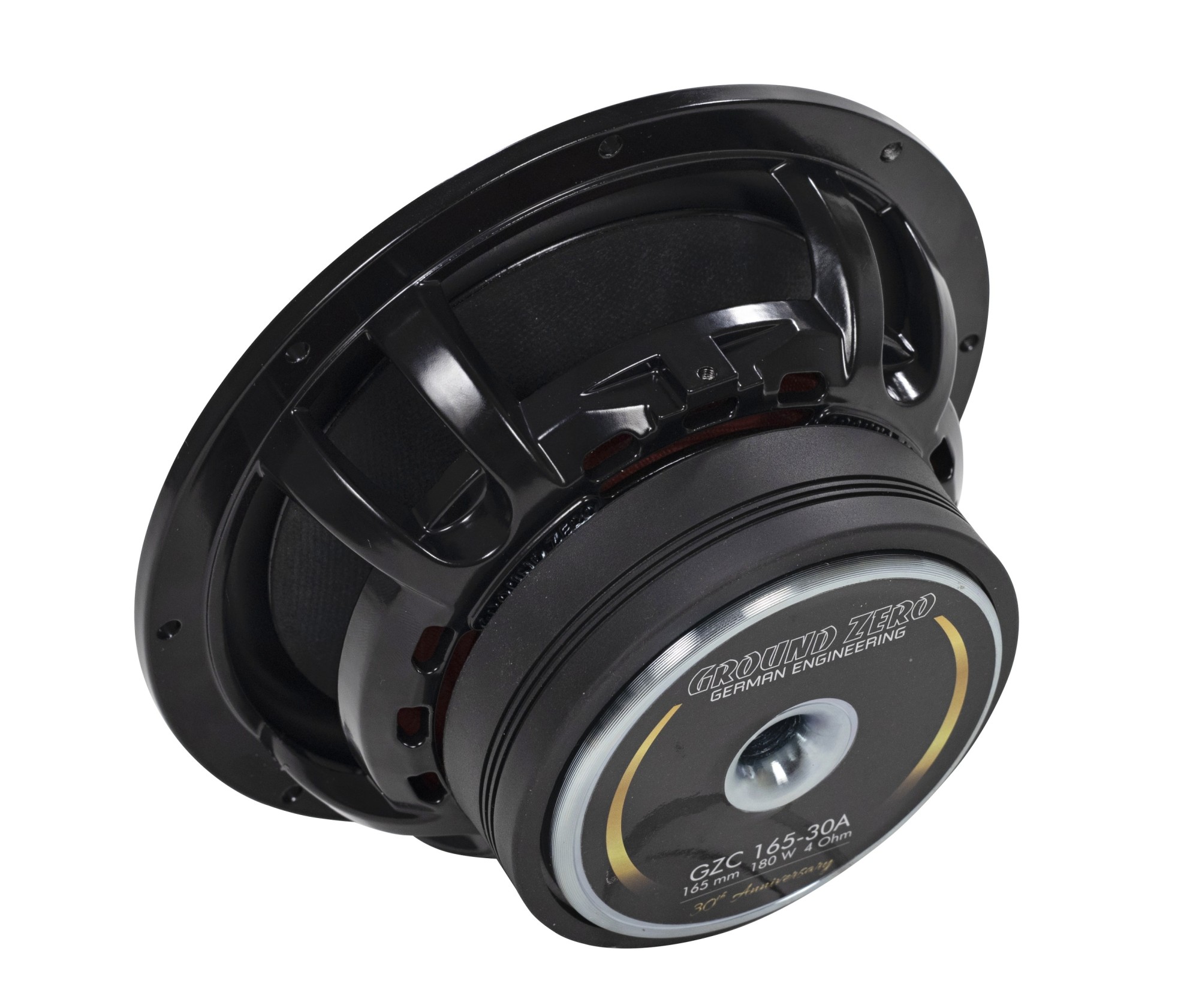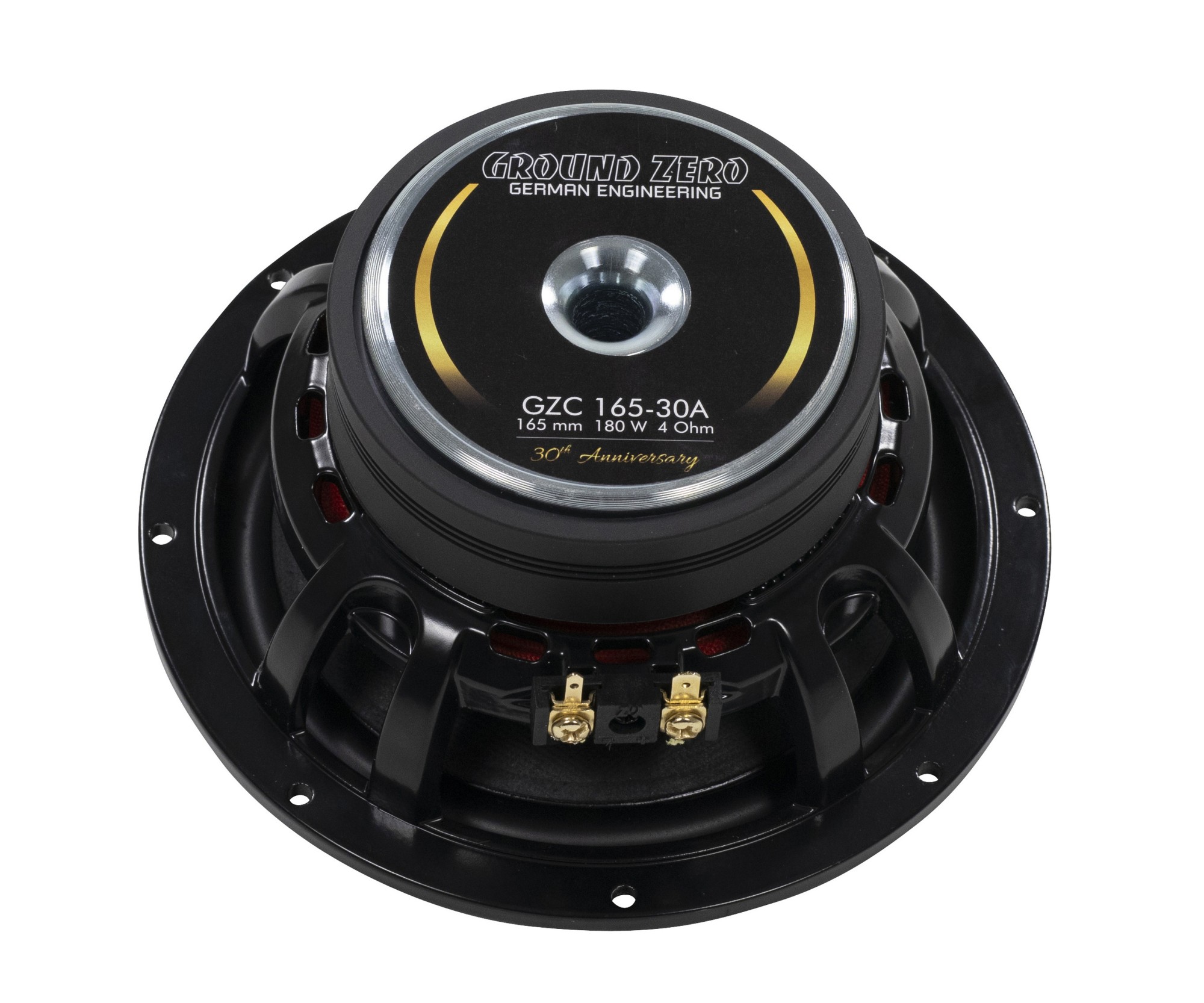 Komponentní systém Ground Zero GZC 165-30A z limitované edice k 30. výročí Ground Zero navazuje na osvědčenou řadu Hydrogen, avšak s řadou úprav a vylepšení. Díky kombinaci robustního středobasu a výškového reproduktoru převzatého z vyšší série Nuclear nabízí tento systém velmi vyvážený zvuk s vysokým rozlišením a dynamikou. Design edice 30A se designově odlišuje exkluzivní černo-zlatou povrchovou úpravou a červeným centrovacím spiderem, který naznačuje použití modernějšího odpružení vyvíjeného pomocí simulačního softwaru a měření Klippel®. Basový reproduktor s 165mm membránou z nelisovaného papíru využívá velkou 38 mm kmitací cívku, robustní feritový magnet a přesně tvarované pólové destičky, což zajišťuje dostatečnou výkonovou rezervu i odolnost při dlouhodobém zatížení. Výškový reproduktor se 28 mm hedvábnou kalotou přináší jemný a detailní přednes, a to i v nižších frekvenčních pásmech, kde se běžné výškové reproduktory již neuplatní. Výhybka je navržena klasickým způsobem s dělicími frekvencemi 6 dB pro basový a 12 dB pro výškový reproduktor, doplněná o kvalitní komponenty a možnost volby úrovně výškového reproduktoru či jemné úpravy středního pásma.