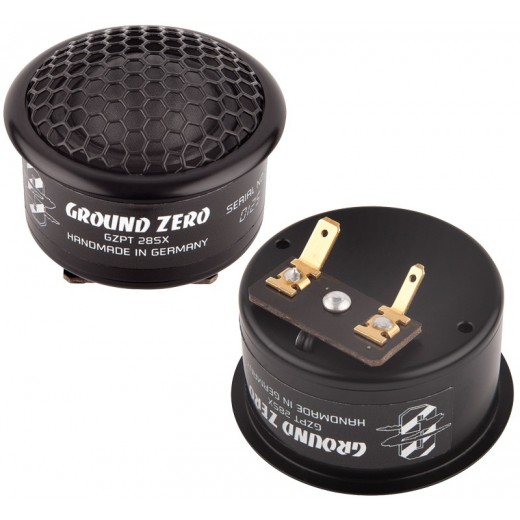 | Typ reproduktorůKoaxiální reproduktory: Koaxiální reproduktory se vyznačují konstrukcí tzv. vše v jednom. Výškový a středobasový reproduktor jsou v jednom koši. Výhodou je jednodušší montáž, ale díky spojení resp. blízkosti pásem v jednom reproduktoru, se obvykle sníží kvalita zvuku. Zpravidla uprostřed středobasového reproduktoru, je výškový reproduktor, jehož kmitací cívka pracuje ve druhé vzduchové mezeře společného magnatického obvodu. Třípásmový koaxiální reproduktor se skládá ze středobasového reproduktoru, ve předu na zvláštním nosníku je středový reproduktor a samostatný výškový. Komponentní reproduktory: Komponentní reproduktory se vyznačují rozdělením na jednotlivá frekvenční pásma, výškové + středobasové + popř. basové pásmo. Jednotlivé reproduktory se dají umístit zcela odděleně, což má za výsledek lepší zvukový i akustický projev. V drtivé většině případů komponentních reproduktorů je dodávaná i externí výhybka, která rozděluje výškové, středové / středobasové a u třípásma i basové pásmo popř. umožňuje nastavení decibelové úrovně u výškového reproduktoru (např. +2 dB, 0 dB, -2 dB), strmosti (např. 6dB/Okt. 12dB/Okt.) či aktivní nebo bi-amp zapojení. | Výškové |