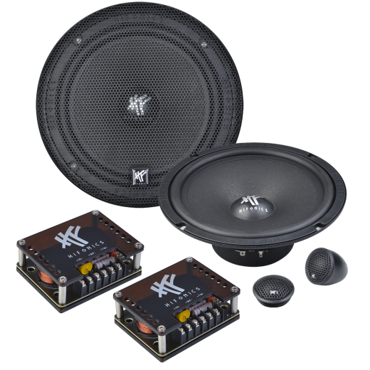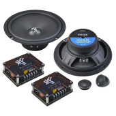 | Typ reproduktorůKoaxiální reproduktory: Koaxiální reproduktory se vyznačují konstrukcí tzv. vše v jednom. Výškový a středobasový reproduktor jsou v jednom koši. Výhodou je jednodušší montáž, ale díky spojení resp. blízkosti pásem v jednom reproduktoru, se obvykle sníží kvalita zvuku. Zpravidla uprostřed středobasového reproduktoru, je výškový reproduktor, jehož kmitací cívka pracuje ve druhé vzduchové mezeře společného magnatického obvodu. Třípásmový koaxiální reproduktor se skládá ze středobasového reproduktoru, ve předu na zvláštním nosníku je středový reproduktor a samostatný výškový. Komponentní reproduktory: Komponentní reproduktory se vyznačují rozdělením na jednotlivá frekvenční pásma, výškové + středobasové + popř. basové pásmo. Jednotlivé reproduktory se dají umístit zcela odděleně, což má za výsledek lepší zvukový i akustický projev. V drtivé většině případů komponentních reproduktorů je dodávaná i externí výhybka, která rozděluje výškové, středové / středobasové a u třípásma i basové pásmo popř. umožňuje nastavení decibelové úrovně u výškového reproduktoru (např. +2 dB, 0 dB, -2 dB), strmosti (např. 6dB/Okt. 12dB/Okt.) či aktivní nebo bi-amp zapojení. | Komponentní 2pásmové |