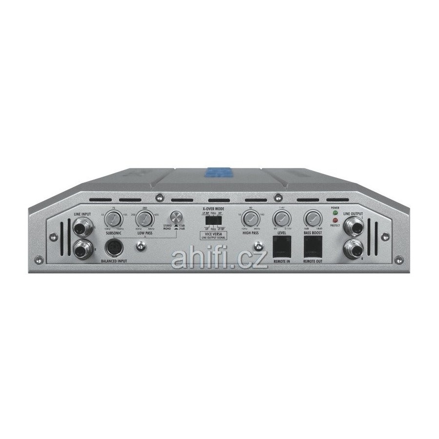 | Horní pásmová propust (HPF)HPF / HP resp. "hi pass filter" nabízí možnost nastavení zesilovače pomocí potenciometru tak, aby střední, případně středobasové a výškové frekvence hrály od určité frekvence směrem nahoru. Příklad: Zesilovače mají nejčastěji HPF od 40 do 300 Hz. Pokud nastavíme na potenciometru hodnotu cca. 150 Hz, budou zvuk ořezán tak, že bude hrát frekvence od 150 Hz až po maximální horní hranici celého frekvenčního rozsahu zesilovače, třeba až 20.000 Hz. Doporučujeme nastavovat tento potenciometr v rozmezí 80-160 Hz. Díky této možnosti nastavení snesou reproduktory vyšší výkon, jelikož je nebudete přetěžovat basy ve spodním frekvenčním pásmu. | 10 - 4000 Hz |
